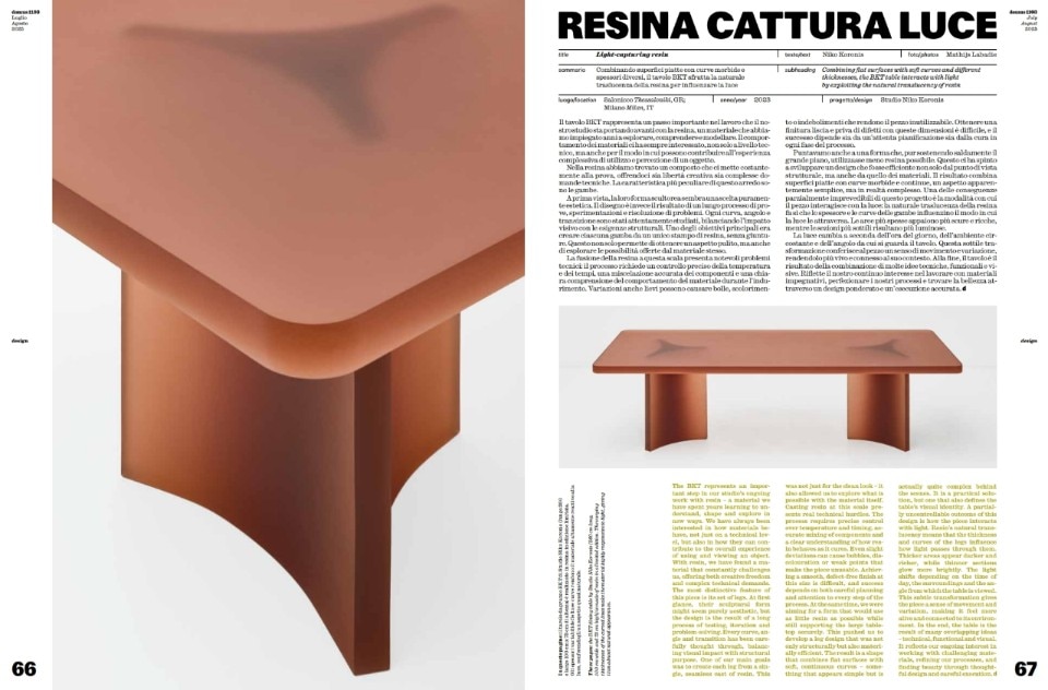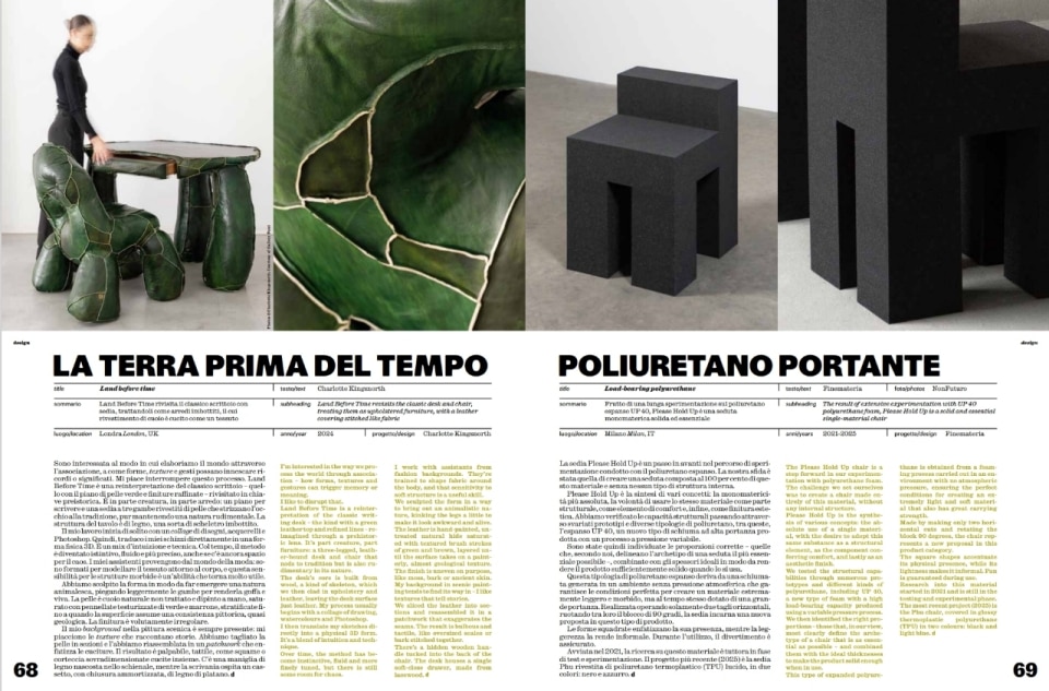 The "Design" section explores the frontiers of furniture and material innovation: Willo Perron presents the "Sausage Sofa," a bold and versatile "playground" of cylindrical modules; Studio Niko Koronis illuminates us with "Light-Capturing Resin" in the BKT table, a "significant step" in resin research; Charlotte Kingsnorth takes us to a "Land Before Time" with a reinterpretation of the classic writing desk covered in hand-painted leather; and Finemateria presents "Load-Bearing Polyurethane" with the Please Hold Up chair, a solid and essential monomaterial seat.