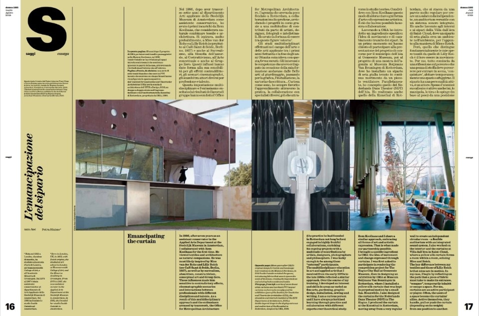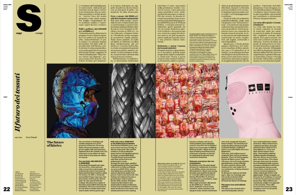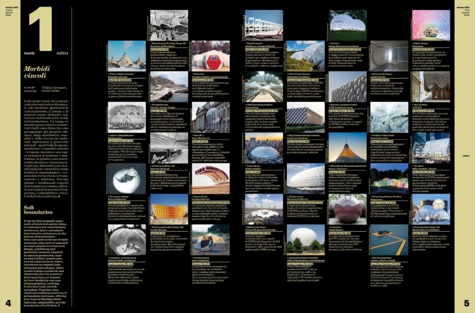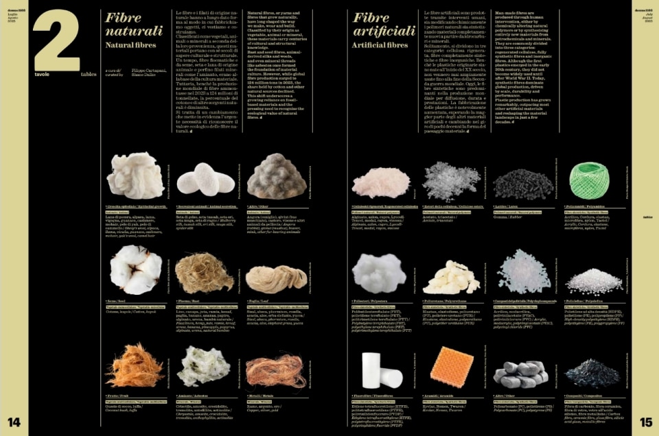 In parallel, Filippo Cartapani and Shane Dalke curate the "Tables," a visual guide through the "Soft Constraints" of fabric and plastic, from nomadic tents to contemporary experimental structures. Petra Blaisse enchants us with her reflection on "The Emancipation of the Curtain," recounting how she introduced the idea of movement and change into architecture through textiles, with examples ranging from the Kunsthal in Rotterdam to the Maison à Bordeaux. The journey into the future of materials continues with Nick Tidball, co-founder of Vollebak, who, in "Future of Fabrics," examines the evolution of clothing from animal hides to lab-grown spider silk and atomically engineered materials, foreshadowing fabrics capable of regulating temperature and harvesting energy.