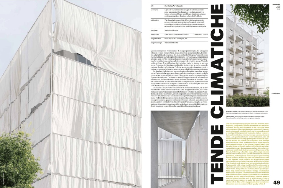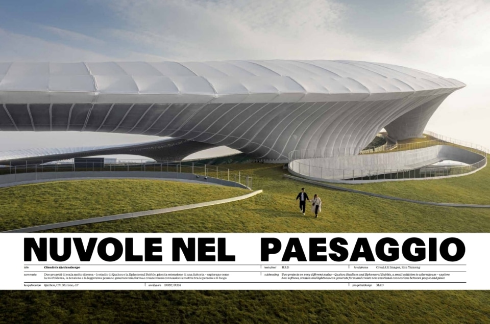 MAD takes us into "Clouds in the Landscape" with the Quzhou Stadium and the Ephemeral Bubble in Japan, exploring how softness and lightness can generate unprecedented forms and new emotional connections. Maio Architects presents "Climate Tents," an innovative residential complex in Sant Feliu de Llobregat where large balconies and external fabric awnings drastically reduce energy consumption.