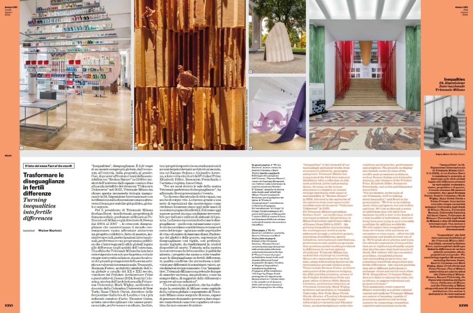 Domus 1103 opens with the "Diary" section, exploring crucial themes of our time. Editorial Director Walter Mariotti introduces the 24th International Exhibition of Triennale Milano, "Inequalities," curated by Triennale President Stefano Boeri alongside 28 other internationally renowned curators (including Norman Foster and Hans Ulrich Obrist). The exhibition tackles growing economic, ethnic, geopolitical, and gender inequalities, with the aim of transforming them into "fertile differences."
