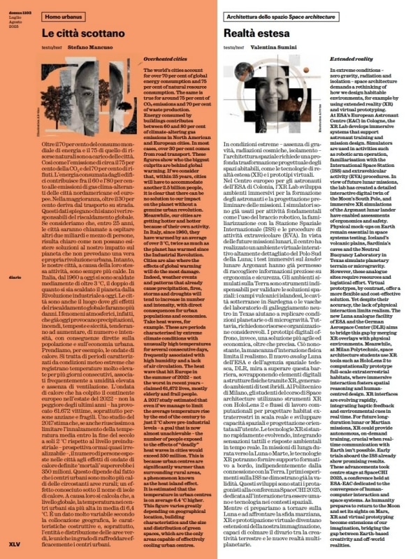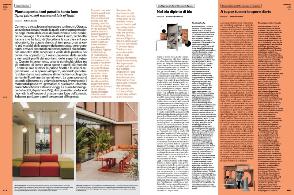 Valeria Casali, in "Interiors," describes the spaces of Sauvage TV in Barcelona, a project by Vania Gaetti that combines exposed concrete and color accents. Roberto Battiston, in "Climate Intelligence," highlights the success of the Montreal Protocol. Marco Pierini, in "The Museum of Tomorrow," reflects on the intimate relationship between observer and artwork. Elena Sommariva, in "Office," presents Alis, the office furniture system by Park Associati for Fantoni. Stefano Mancuso, in "Homo Urbanus," emphasizes how cities are the main contributors to global warming. Valentina Sumini, in "Space Architecture," explores the use of extended reality (XR).