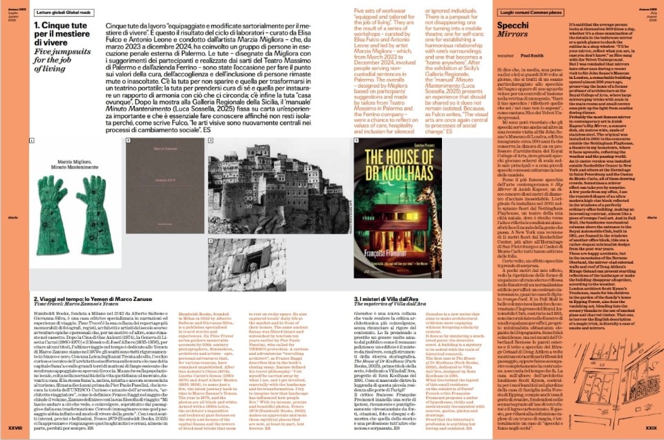 The "Global Readings" section presents the "Five Overalls for the Art of Living" project, documenting an inclusion initiative with people serving sentences in Palermo, and "Journeys Through Time: Marco Zanuso's Yemen," a 1979 photographic report published by Humboldt Books celebrating ancient Sana'a. It also analyzes "The House of Dr. Koolhaas," the first title in Park Books' new "Gumshoe" series, which investigates Rem Koolhaas's Villa dall'Ava as a true architectural mystery.