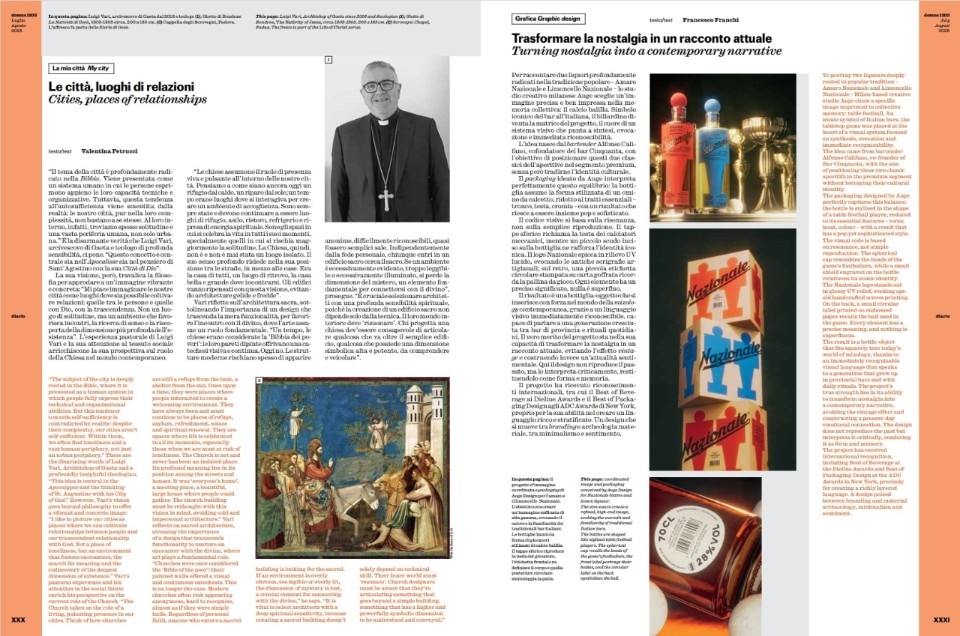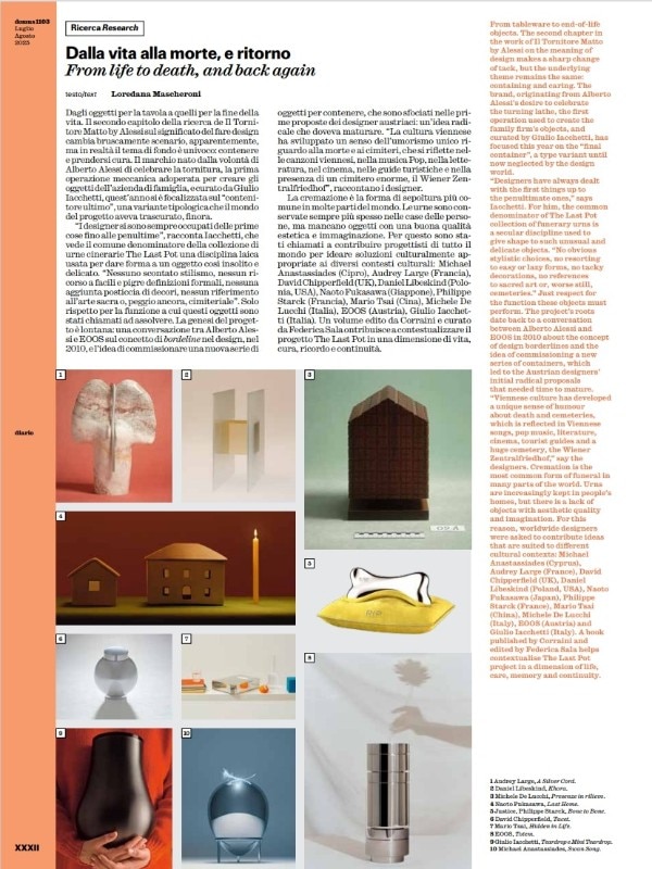 Paul Smith, in "Common Places," reflects on the evocative power of mirrors in art and architecture, citing works like Anish Kapoor's "Sky Mirror." Valentina Petrucci, in "My City," explores the concept of the city as a place of relationships and the importance of sacred architecture according to Luigi Vari, Archbishop of Gaeta. Francesco Franchi, in "Graphics," analyzes Auge Design's innovative design for "Nazionale" liqueurs. Loredana Mascheroni, in "Research," introduces "The Last Pot" collection of cinerary urns by Il Tornitore Matto by Alessi.