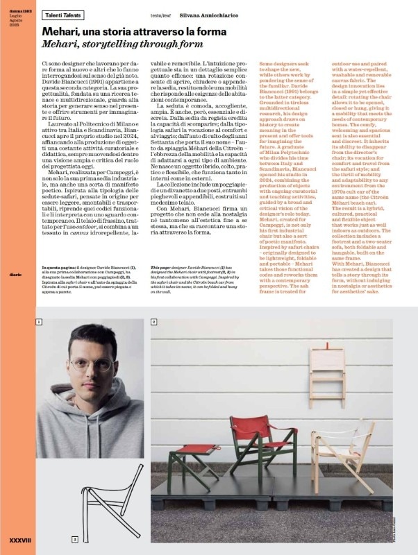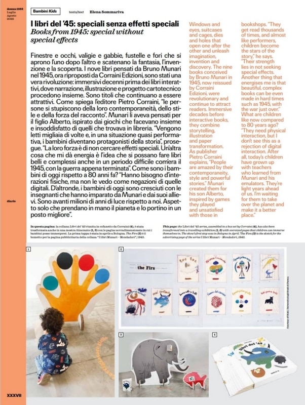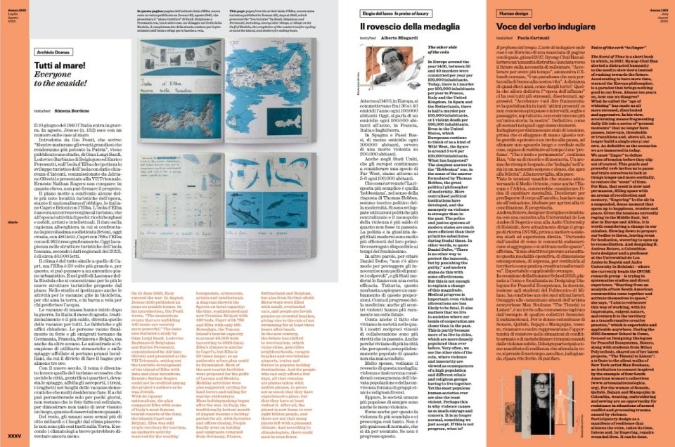Alberto Mingardi, in "In Praise of Luxury," analyzes the decline of violence in modern societies. Paola Carimati, in "Human Design," discusses the importance of slowing down, a key concept revisited by Byung-Chul Han, and introduces Andrea Botero's work on participatory design. Elena Sommariva, in "Children," celebrates the re-edition of Bruno Munari's nine books from 1945. In "Talents," Silvana Annicchiarico presents Mehari by Davide Biancucci for Campeggi. Antonio Armano, in "Companies," narrates the growth of PLH Italia by Enrico Corelli. Elena Sommariva, in "Minimalisms," dedicates space to Cini Boeri's bag, a 1970s project now produced by Prada in Re-Nylon.