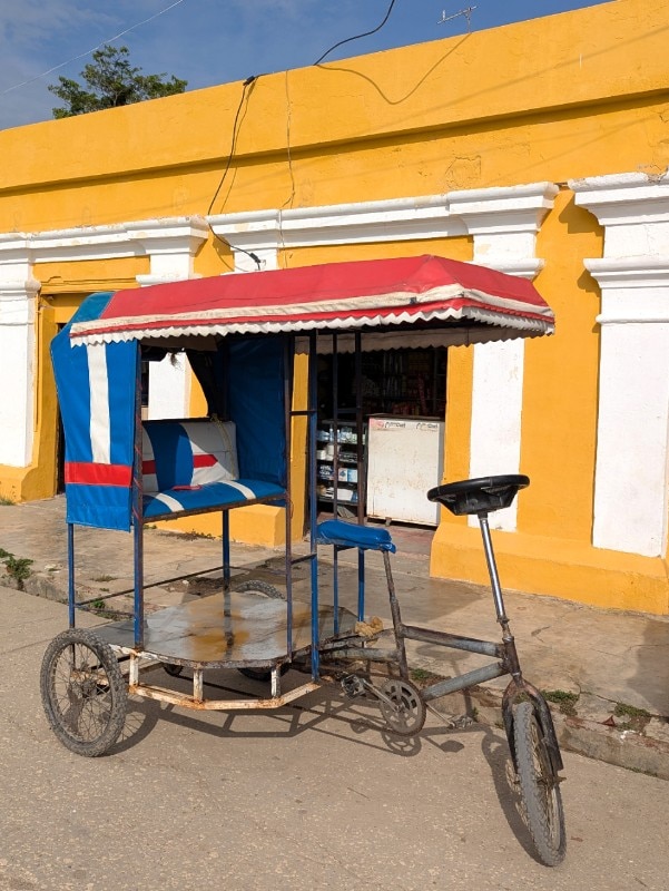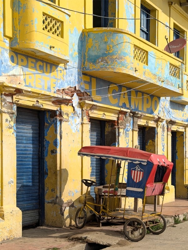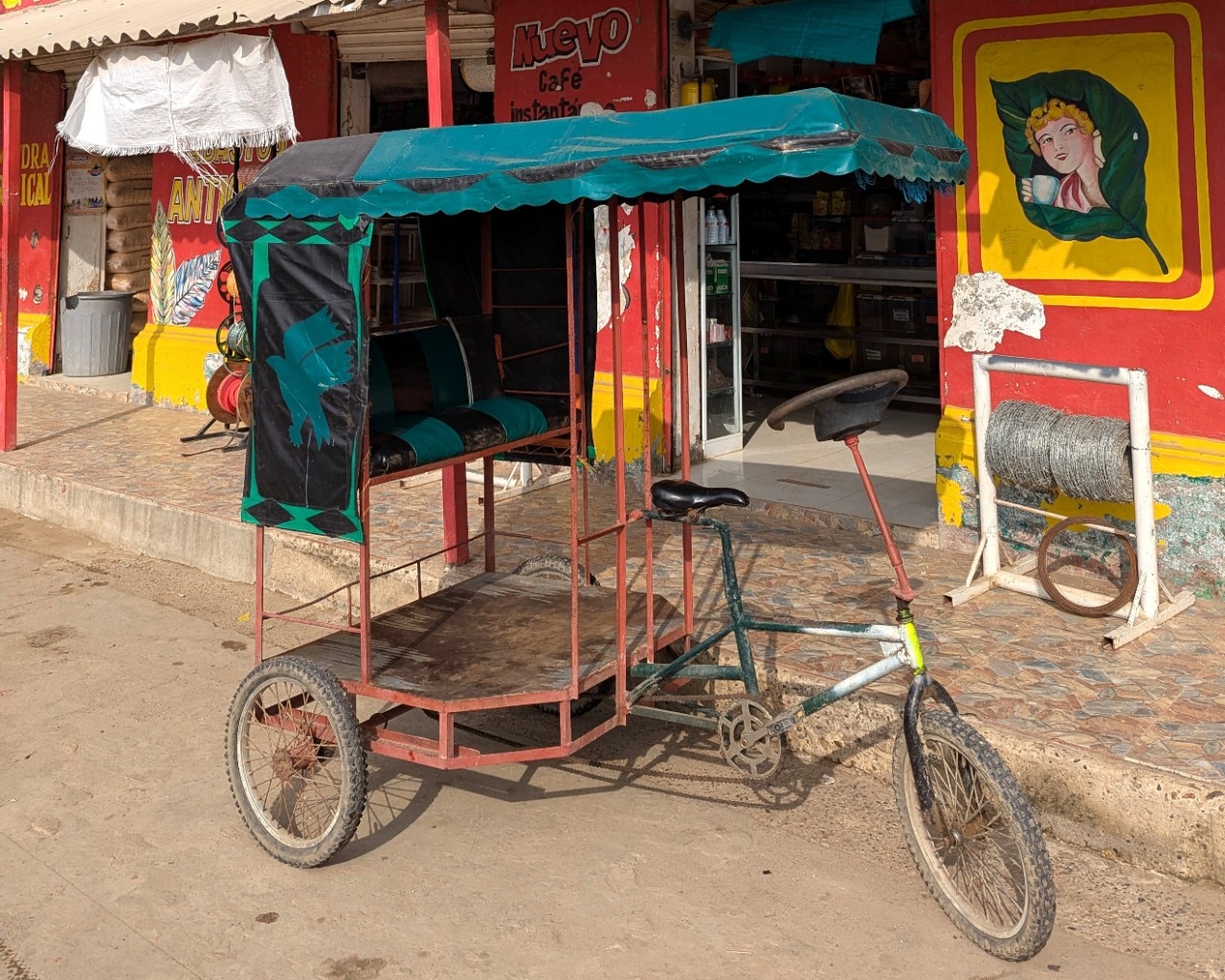 Many of the bicycle taxis boast bright lacquered colors and images on the cab and carp. The local name for these modified bikes is Paola, which comes from the name (written across the back) of the daughter of the man who first built and operated a bicitaxi. Most bicitaxis are already old and creaky, barely held together with soldered nuts and bolts, tape, string, paint. This quaint, antiquated means of transportation reflects the faded glory of the town.