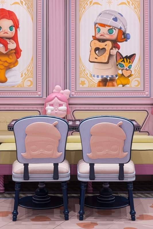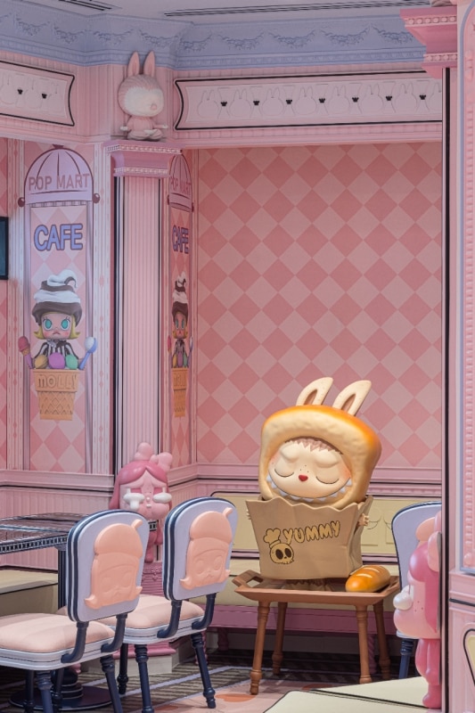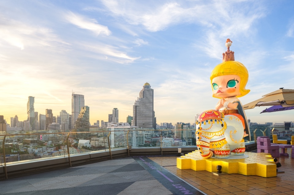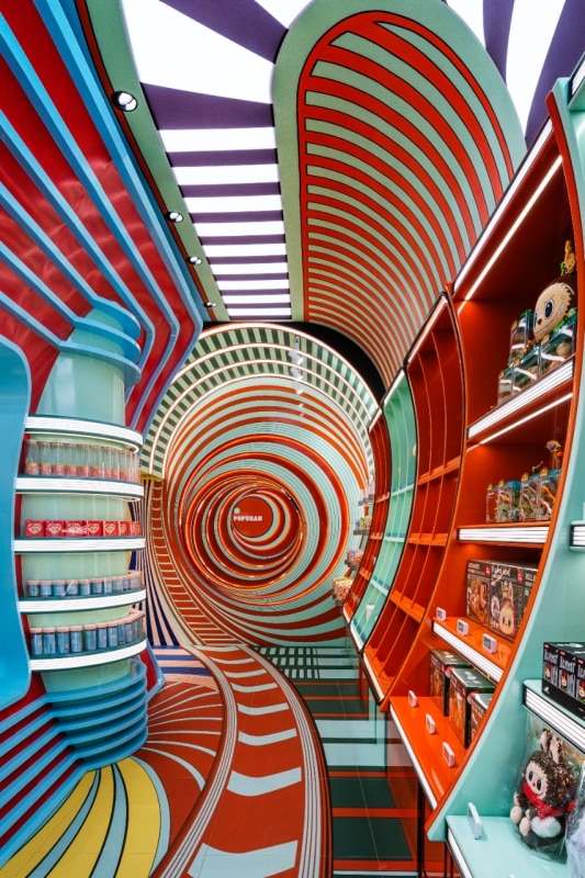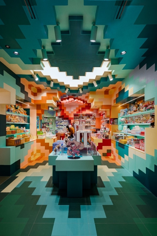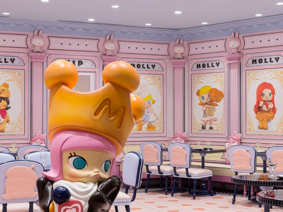 An articulation of interconnected spaces, unexpected perspectives, enveloping fluid forms and sucking vortexes deconstructs the traditional space, subverting its Cartesian constraints and reformulating new emotional geometries in which fairy-tale puppets peep out: from the entrance space conceived as an intricate music box; to the terrace dominated by the 4 metres high Molly installation, sitting atop an elephant in traditional Thai dress (a tribute by the global brand to local culture); to the exhibition areas on the first and second floors, where floors and walls intertwine to form a kaleidoscope of images, colours, furnishings and candies; in the café dotted with unlikely elements borrowed from Western architectural vocabulary, including arches, mouldings and pilasters with capitals consisting of Labubu in the lotus position.