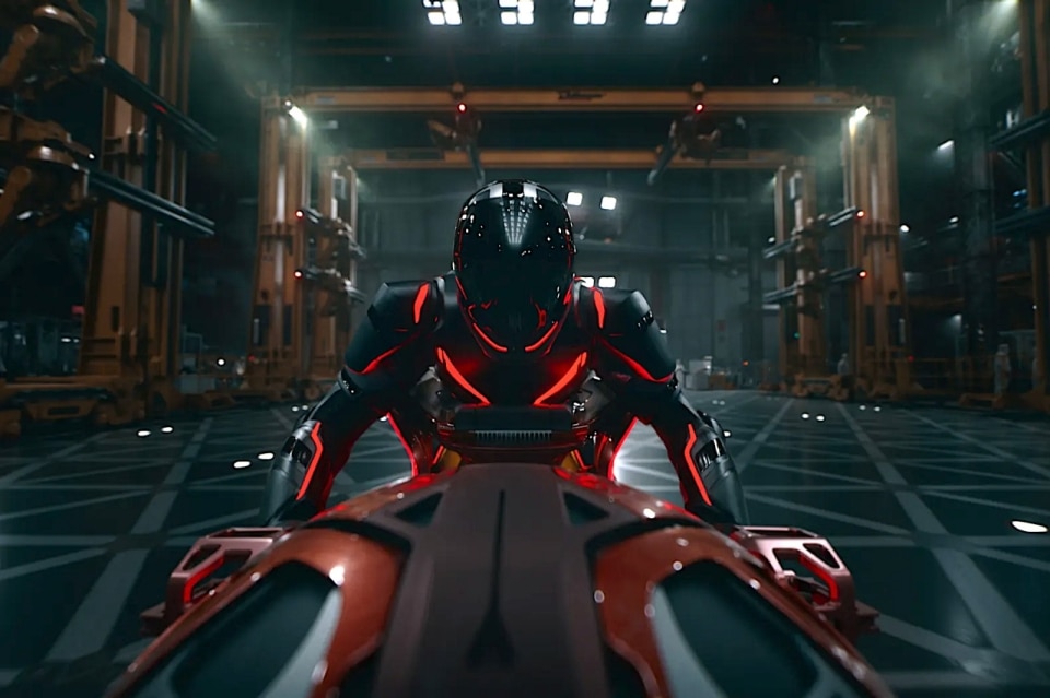 The film depicts this by transporting real people into the digital Grid world—and vice versa, bringing humanoid programs into cityscapes at night, recreating Tron’s neon-on-black palette in urban settings. It merges American city architecture with the franchise’s signature futuristic design, synchronizing all of it with the rhythm of the music. Once again, the digital reconstruction isn’t used to create photorealistic landscapes but to overlay an abstract layer of design—made of lights and shadows—onto our world. The Tron motorcycles move through streets leaving trails of light, as in Akira, except these aren’t optical effects but solid digital barriers that can collide or imprison.