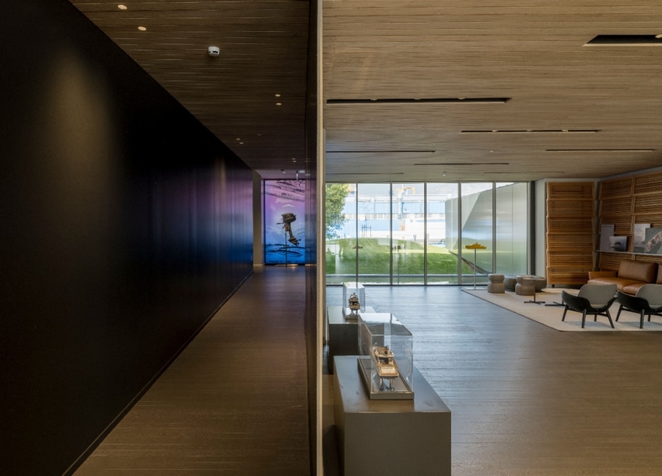 The ex novo pavilion acts as the new entrance and the first stop on a journey to discover the brand's glamorous history and future outlook. The multifunctional building contrasts sharply with the adjacent historic building – a massive structure topped by turrets and finished with polychrome bands and blue brushstrokes on the fixtures and roofing – recalling the identity of the shipyard through its essential geometry and metal cladding. A pool of water reflecting “the first times” (models of the first boats designed by the group) accompanies visitors to discover rooms bathed in light filtering through the large glass wall at the entrance. Inside, wood and aluminium cladding evoke the warm, textured atmosphere of boats, amid iconic objects (the engine of the first boat displayed in a lightbox) and LED walls for dynamic storytelling.