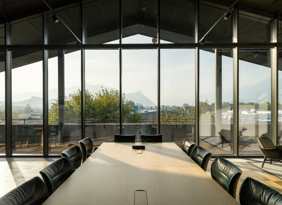 In the historic building, directly connected to the new structure and completely renovated, AMDL CIRCLE's intervention involved a portion of the ground floor, where large sculptural objects (Sea Rocks) illustrate the brand's innovative materials and cutting-edge technologies, and the third floor, which houses the boardroom and main meeting rooms. A new “promenade” connects the different areas and the three previously separate towers, offering privileged views of the nearby Sacra di San Michele and the mountain landscape from the large continuous windows and panoramic terraces.