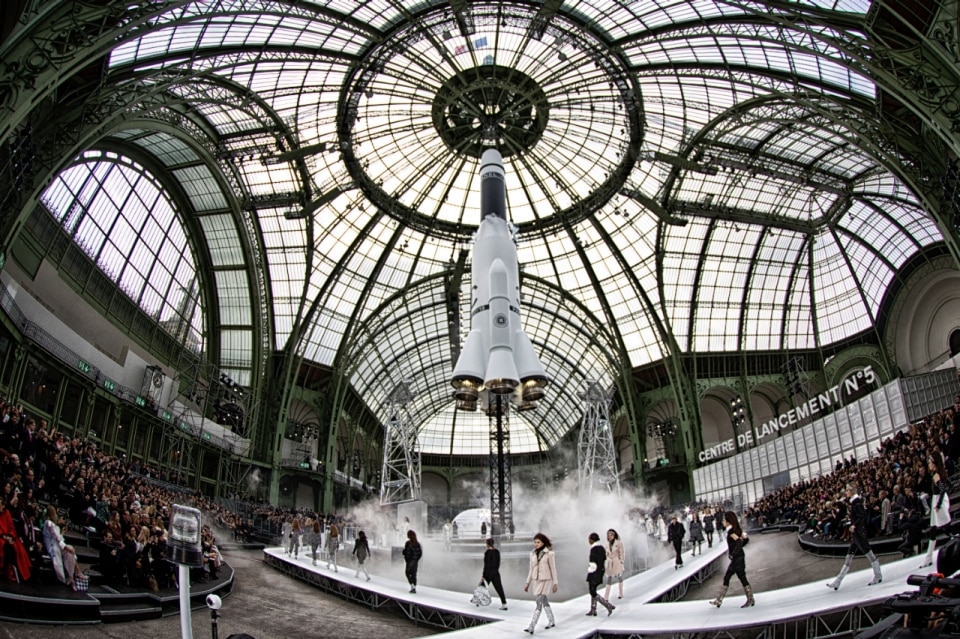 “Digitalization adds another layer to the fashion show, but it cannot replace it,” comments Eisenbrand — perhaps summing up a collective sentiment, especially as we witness one of the most popular trends of recent years: fashion shows staged within true architectural icons. On one wall of the fourth and final room are images from Chanel’s Ready-to-Wear Fall/Winter 2017–2018 show inside Paris’s Grand Palais, recently renovated for the Olympic Games.
