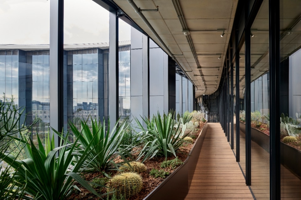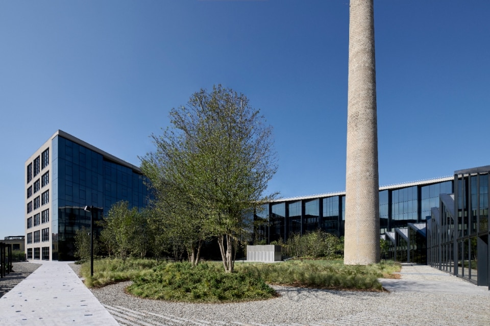 Located at Via Ortles 38, the new complex extends across six floors and 77,000 square meters, housing offices, communal spaces, a greenhouse, and a showroom. The architecture preserves the site’s industrial memory: the historic chimney of the former factory has been retained as a distinctive feature, anchoring the modernity of the complex to the area’s manufacturing past. The glass façades, framed by metal structures, open the interiors to natural light and the city, promoting transparency and visual connection across the various levels. At the center, a glass greenhouse brings daylight and greenery into the building.