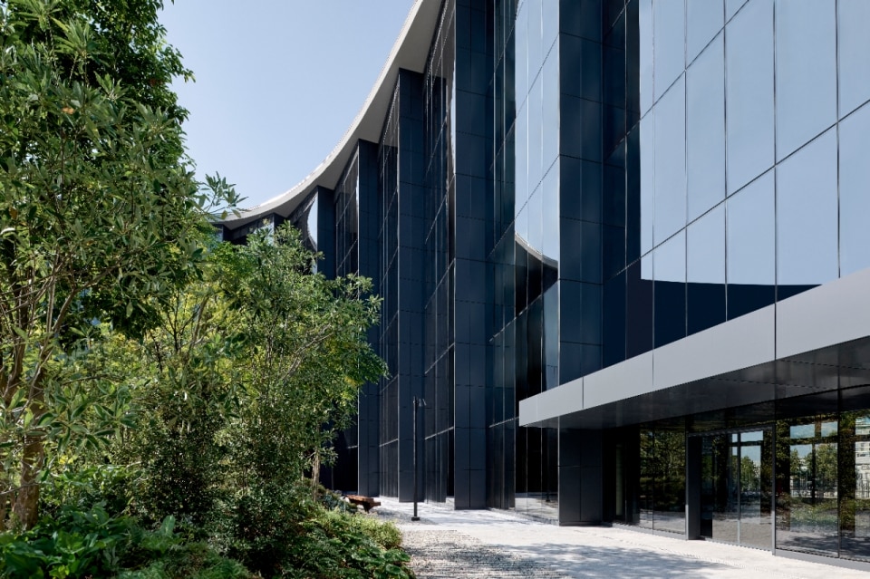 On the eastern side of the complex stands the independent showroom — an autonomous, double-height volume of about 4,500 square meters dedicated to showcasing Moncler’s collections.