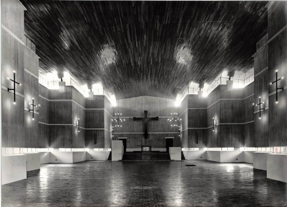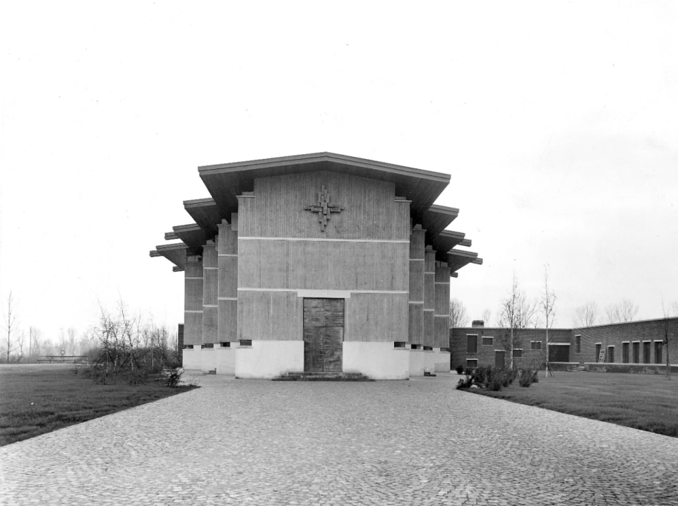 Although Gardella had begun designing much earlier in his native city—indeed, Milan’s Casa al Parco served as inspiration for Alessandria’s Casa Borsalino—the exhibition, by curatorial choice, skips over the first twenty years of his Milanese projects. It focuses instead on works completed from the 1950s onward: the INA-Casa complex (1951–1956) and the Church in Cesate (1954–1963), followed by the Church of Sant’Enrico in San Donato Milanese (1962–1966) and the House at the Gardens of Hercules (1949–1954), celebrated for its avant-garde plan flexibility and absence of a typical floor plan, reflected in the façade composition.