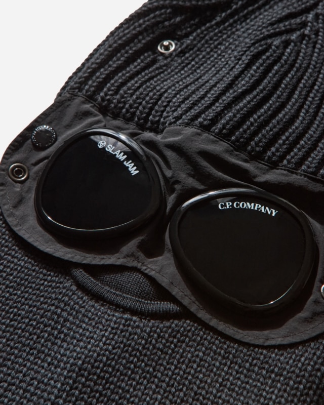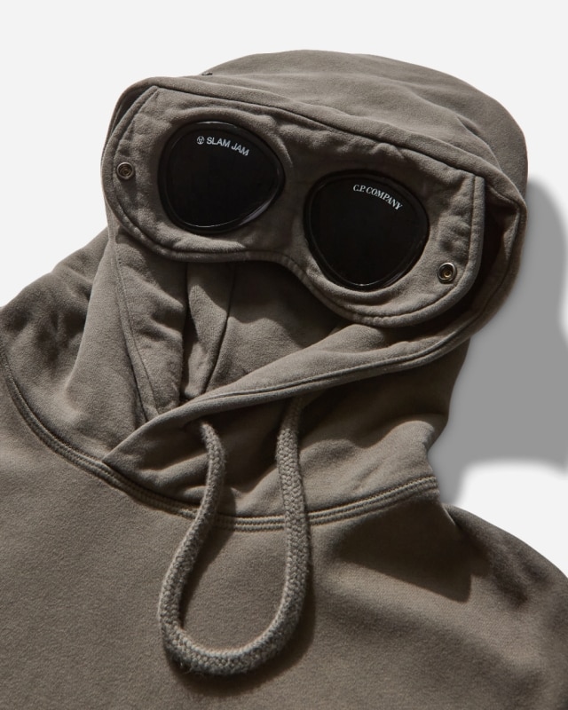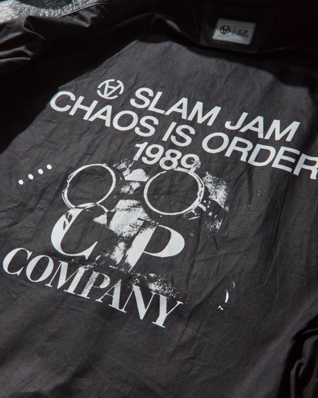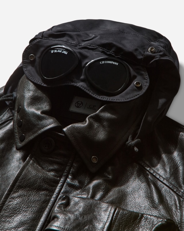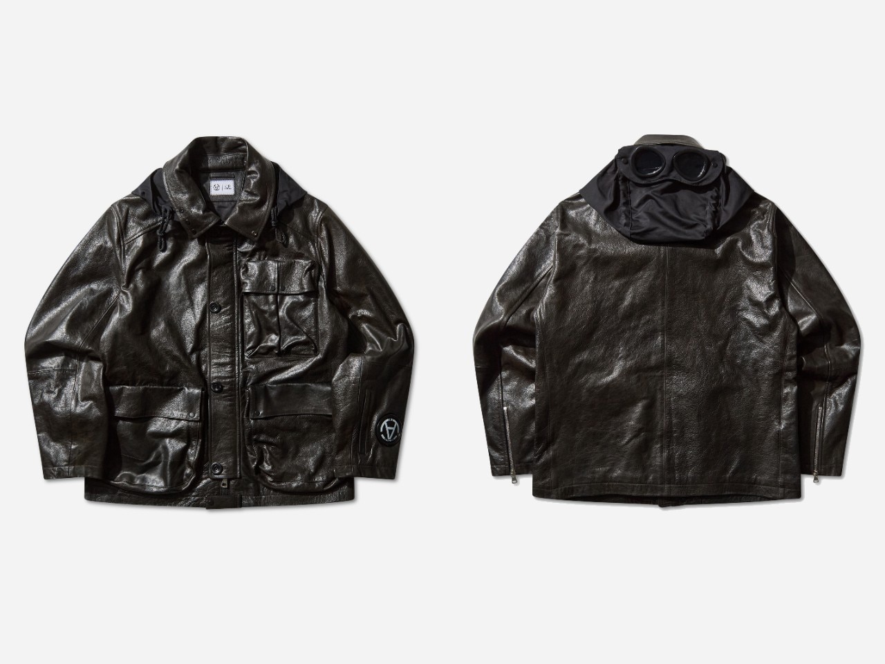 The connection is further sealed by the C.P. Company x Slam Jam capsule collection accompanying the show: a limited-edition line that includes the iconic Mille Jacket designed by Massimo Osti, here reinterpreted in leather with an internal print of a photograph by Facchinato, a hooded sweatshirt, and a Goggle balaclava — all featuring co-branded lenses. Garments, yes, but also collectible objects: aesthetic fetishes of a rebellious, post-industrial mythology.