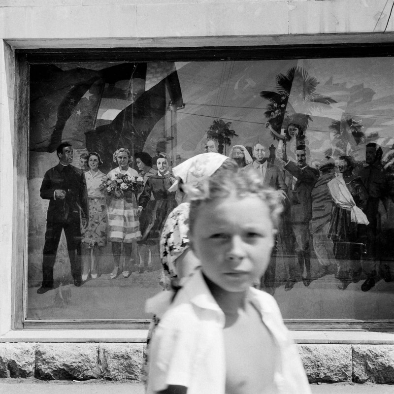 The only people walking Moscow’s streets are women and children, often photographed in front of propaganda posters and immersed in the shop windows of emerging American-style commercial chains. Men appear very little: they are in factories producing weapons for a war (the Cold War) fought more with assembly lines than with guns.
