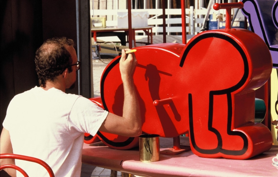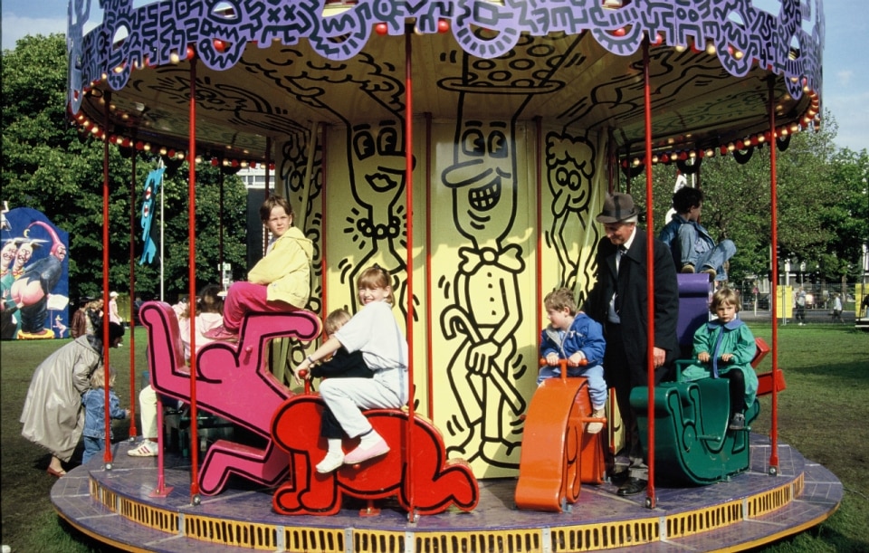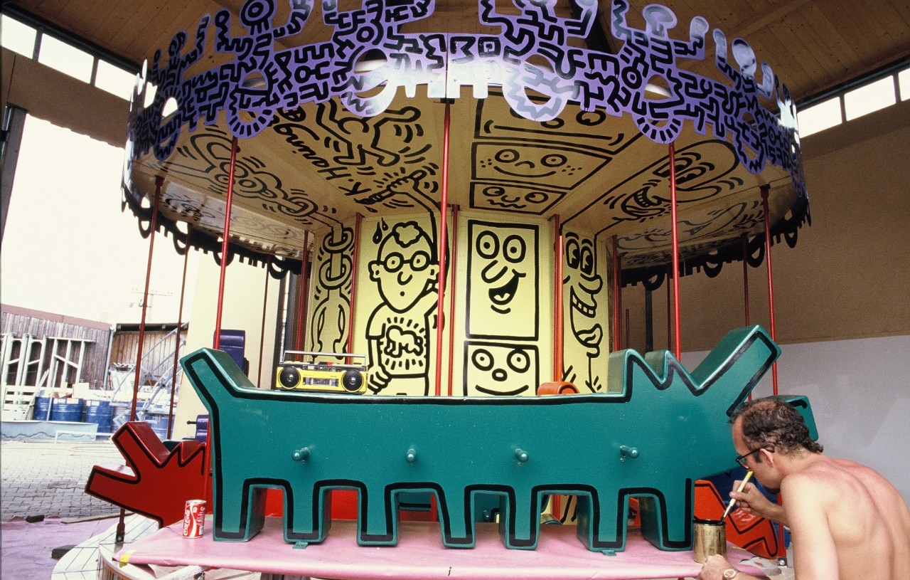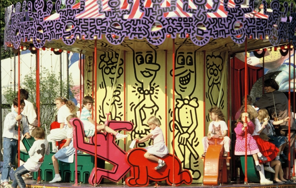 In Moorweide Park in Hamburg during the summer of '87, one could walk through a colorful door designed by Sonia Delaunay and enter a toyland: Moon Moon was the visionary project to turn a playground into a museum, or a museum into a playground. The idea had come from André Heller, an artist, curator, and songwriter who for the rides, conceived as site-specific works, had called Basquiat, who would spin a Ferris wheel to the tune of Miles Davis, Dali, who would create a "Dalídom," Hockney a super-colored pavilion, Tinguely a poster, and Beuys, who would write a poster. And then there was also Keith Haring.