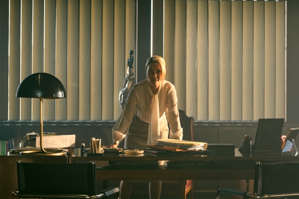 The Playmen editorial office is the visual counterpoint to the penthouse: a masculine space reinvented through a feminine gaze — Adelina’s. The large windows overlooking the dome of St. Peter’s are not just a scenic flourish: they are the perfect image of the contradiction between modern hedonism and Catholic tradition, between freedom and censorship, between body and dogma. The furnishings do the rest: the large mustard-coloured sofa with sculpted lines and brass feet at the entrance; the drafting tables, lightboxes, multicolour tunnel photo sets — all speak of an image workshop that is also a workshop of desire.
