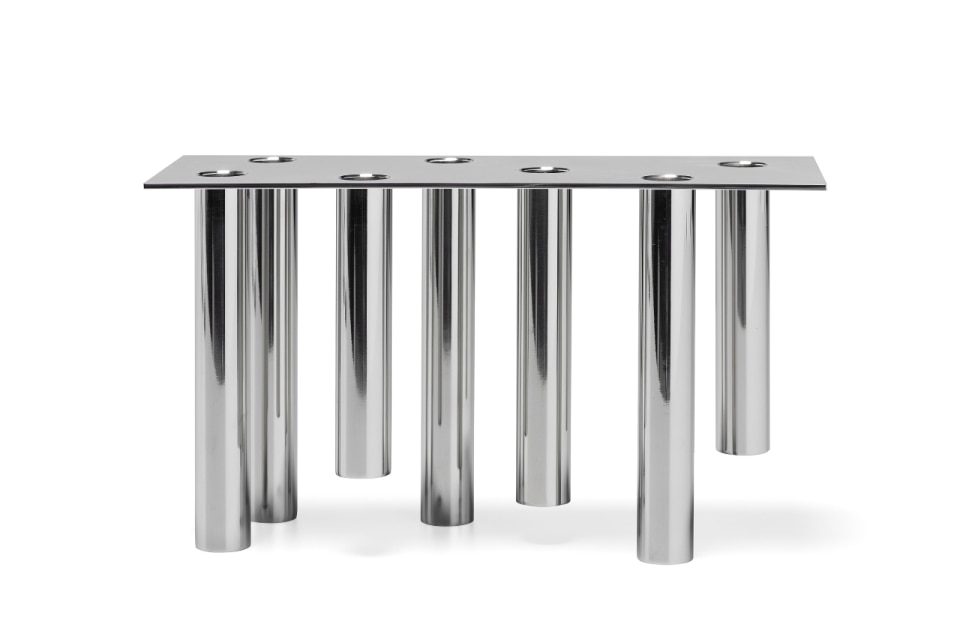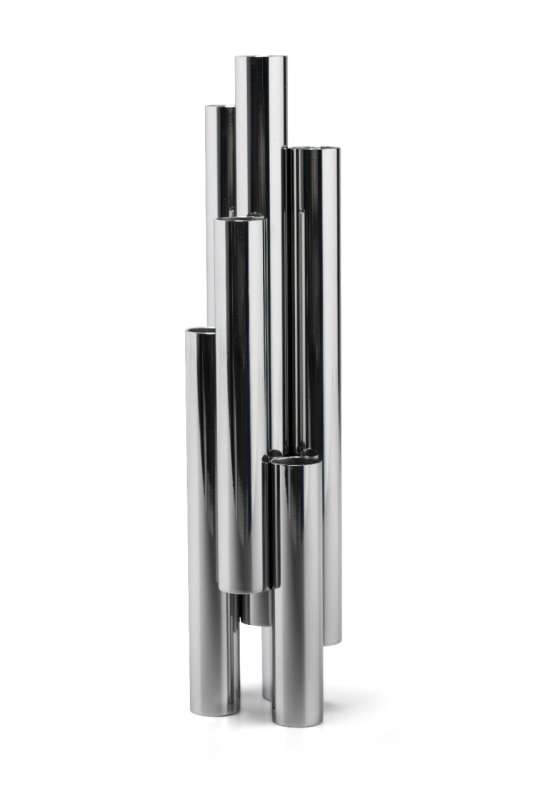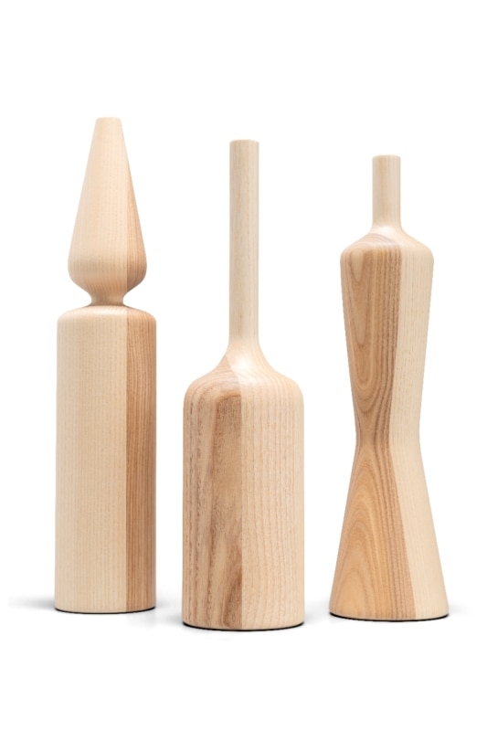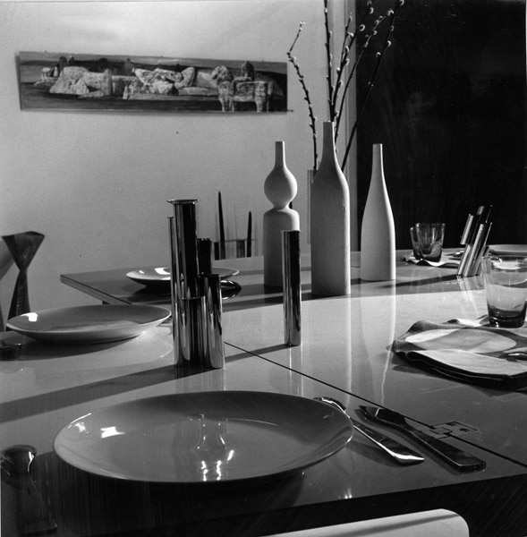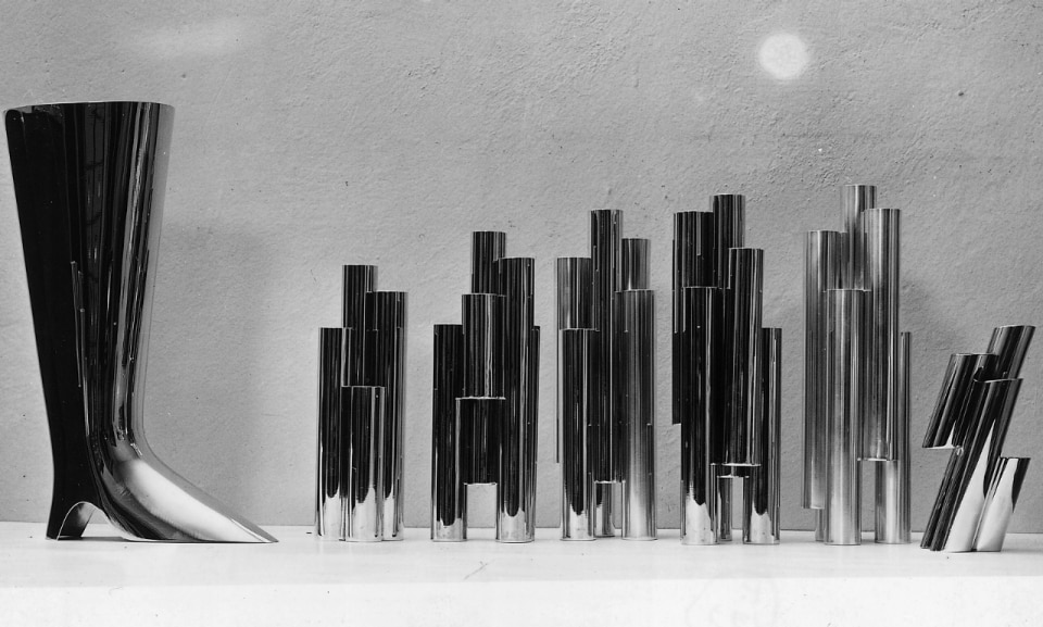The objects-different in use, forms and materials-indicate Gio Ponti's multifaceted approach, the outcome as well of a tireless exchange with the most influential personalities and realities of his time, such as the silversmith Sabbatini, the Buccheri Antonio Rossi workshop in Gubbio, and the engineer Pier Luigi Nervi, a partner in the design of the Pirelli Skyscraper. The objects made with Lino Sabbatini - in silver in the original version - are reborn in stainless steel, alongside the set of wooden "Bottles" and the bucchero vase, the result of sensitive and careful research into the material.