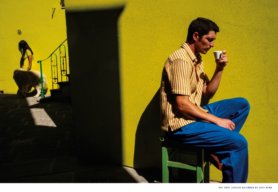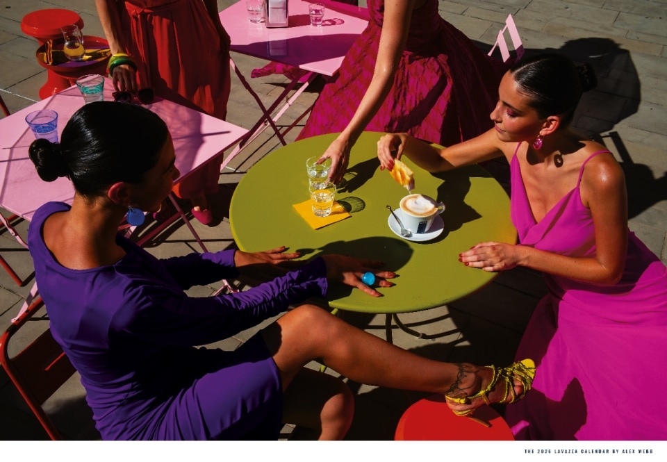 “We know photography can tell anything, express anything,” says Francesca Lavazza. In this edition, Italian-ness is constructed through Webb’s vision: outlined on a café table and carried forward in the metaphor of coffee. Current relevance is secondary; what matters is that it feels “dolce”—sweet.