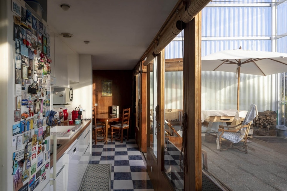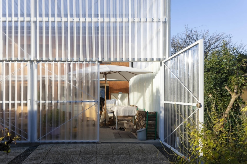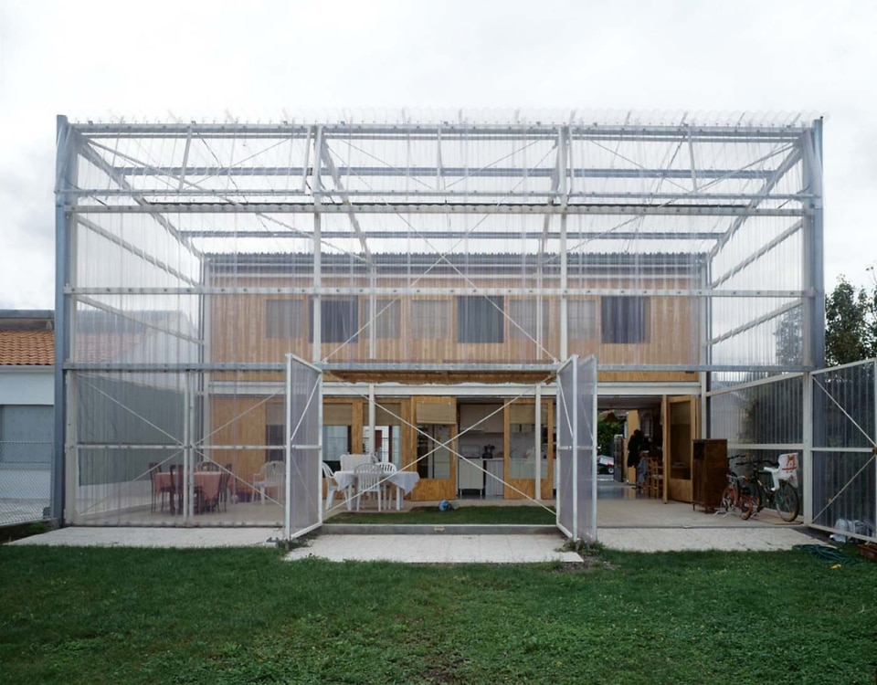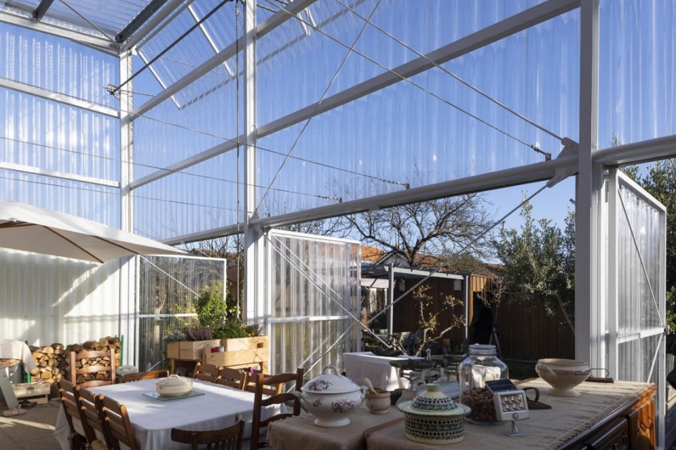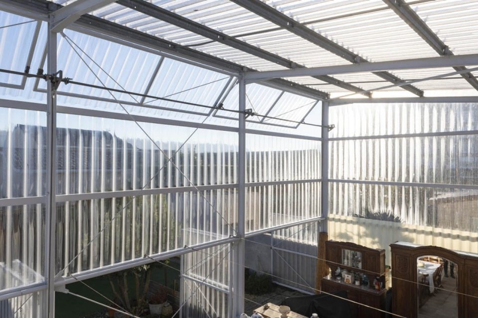 A large one was built, using steel profiles and corrugated panels: transparent polycarbonate facing the garden and fiber cement toward the street. A wooden box, would then be slipped inside: the “real” house.