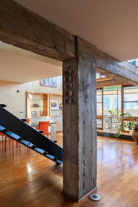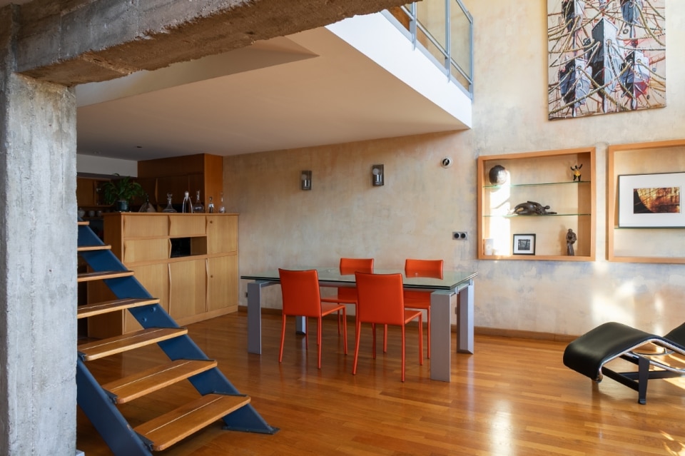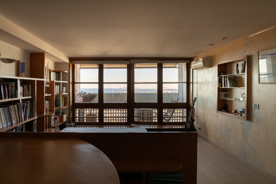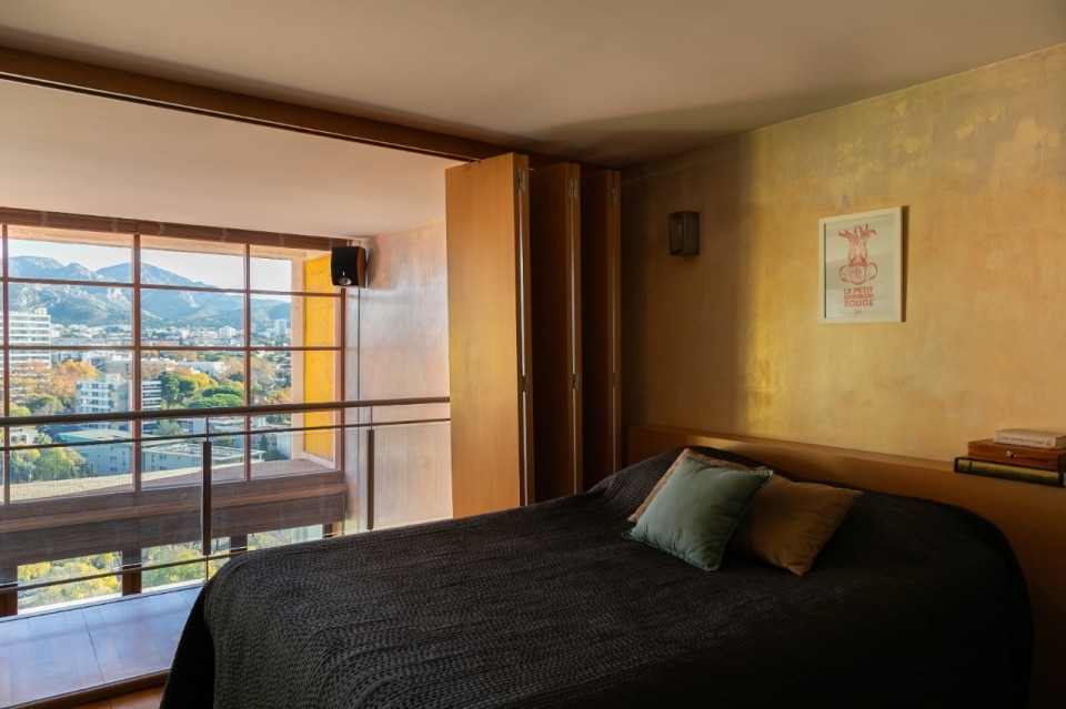 Marseille, Unité d'Habitation; spanning an area of two hundred square meters is an apartment created by the union of two of the double-height units, bathed in natural light and characterized by the sign of concrete beams and pillars left exposed. It is now for sale at one million four hundred thousand euros.