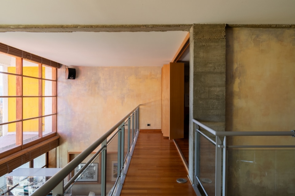 The ground floor houses the living area with a living room, kitchen, dining room and a small library, and extends opening into a loggia - also doubled by joining with the adjacent one - of 32 square meters.