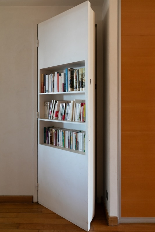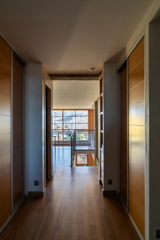 Going up the Prouvé-designed staircase, the sleeping area still enjoys the light from the large windows that perimeter the apartment and is sheltered by a folding wooden fan wall. It houses the spaces of rest and work: a "master" suite and two other rooms, all with their own bathrooms and a "boat" shower, and then there is a studio.