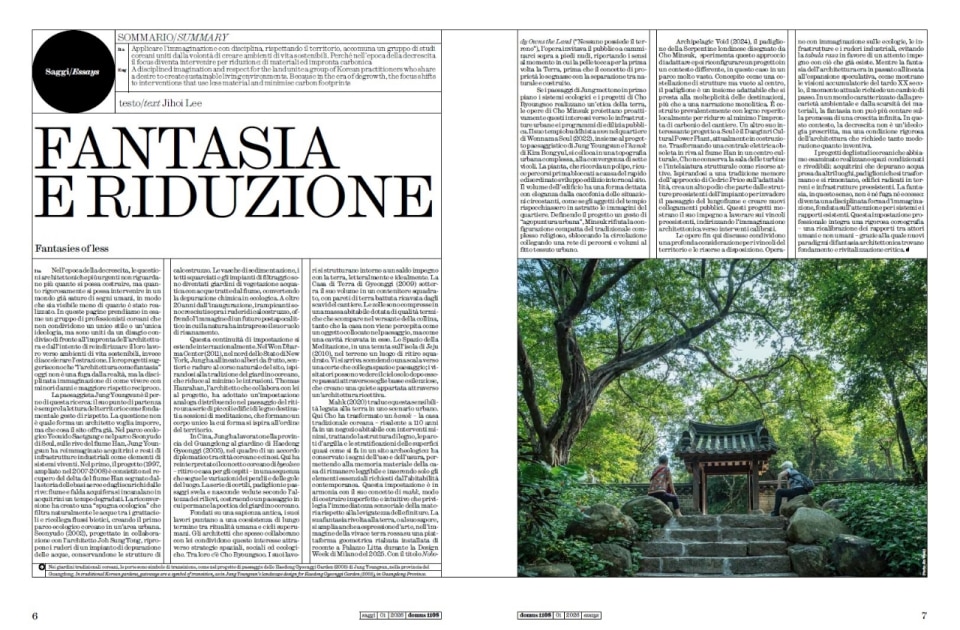 Ma Yansong greets us with a provocation that is, at its heart, a liberation: architecture is not architecture; it is fantasy.He invites us to peer beyond the veil of economic development—the very phenomenon he observes in his native China—to find not just metrics, but the beauty of a possible originality. This yearning for imagination intersects with the reflections of Jihoi Lee, who explores the Korean scene through a "fantasy of reduction." Here, the dream is not about accumulation but masterful subtraction. The work of Jung Youngsun on living systems and the subterranean stillness of Cho Byoungsoo remind us that to imagine also means knowing when to stay silent, making room for nature.
