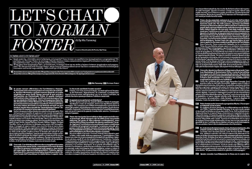 The conversation turns historical and monumental with Thomas Krens, who traces the currents of creativity through thirty years of iconic museums. From Gehry to Nouvel and Koolhaas, a constant tension emerges between the flight of transcendence and the iron grip of the Zeitgeist. This same tension vibrates in the dialogue between Ma Yansong and Norman Foster, where design is stripped back to its essence: a tool for the survival of the species. Foster reminds us that, even amidst global crises or digital shifts, technology must remain handmaid to a poetic vision capable of shaping a future we do not yet dare to inhabit.