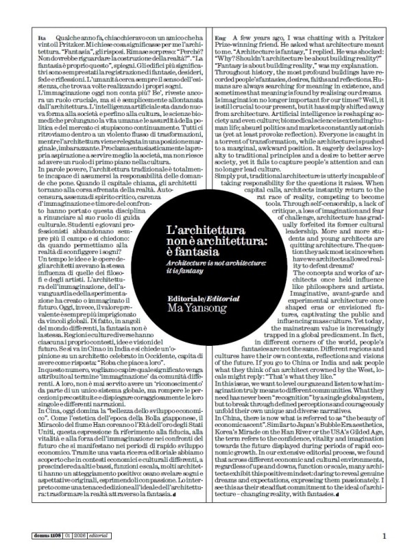 In this January issue, marking the dawn of 2026, Domus explores the art of inhabiting the present. Under the stewardship of Ma Yansong—the latest Guest Editor of our magazine for 2026—the editorial program morphs into a collective dream: a radical inquiry into that primordial force we call fantasy. This is no flight of fancy, but a conscious act of resistance. In a fragmented era, ruled by algorithms and the "dictatorship of capital," architecture reclaims its role as the essential mirror of our boldest desires.