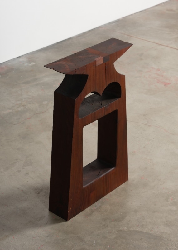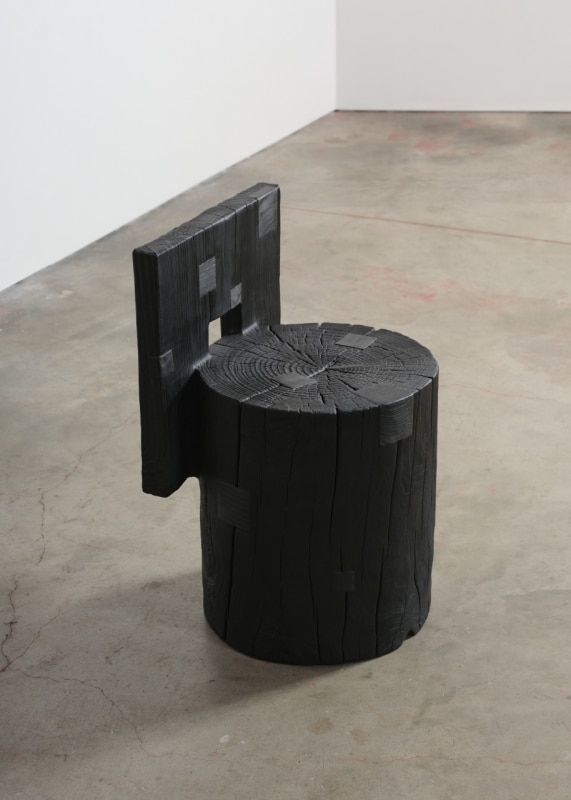 The results oscillate between authorial cabinet-making and the ready-made. Dan John Anderson’s chair recalls the charring effects of fire, while Ryan Belli combines Ponderosa pine and aluminium in a sculptural, monumental structure that seems to exorcise trauma through symbolic abstraction. Noah Cohen works by subtraction, carving a chest from coastal live oak and decorating it with egg tempera, while Rachel Shillander, with Power Pole, treats a block of oak as if it were “embroidered” with nails into a form of communal fabric. All the works seek to go through the transformation of matter, becoming objects that witness destruction and, at the same time, overcome it.