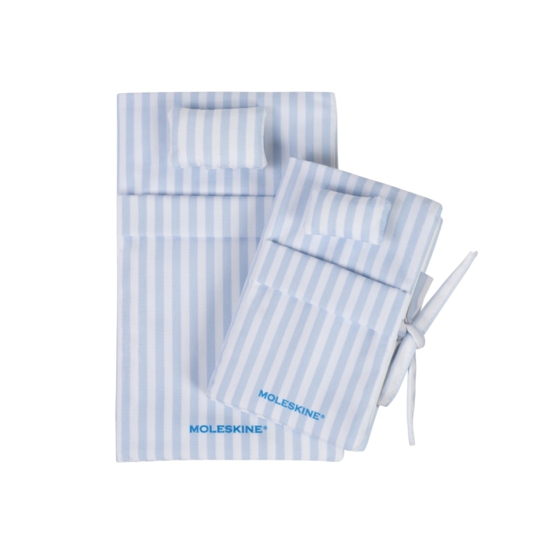 Among them is the Emotional Care Large Notebook Set: a large-format notebook with a blue-and-white striped fabric cover and a “No. 600” patch, which visually recalls hospital-bed aesthetics through colors and materials typical of clinical furniture.