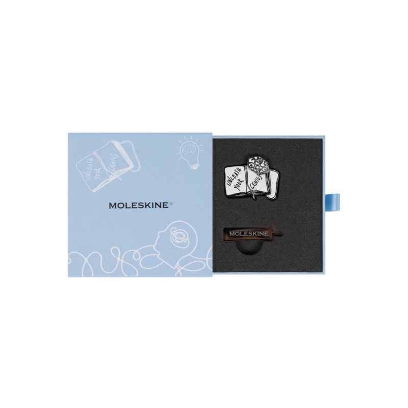 Alongside the notebook, the line includes a pin featuring a rotating graphic element inspired by brain activity, a pocket notebook set with structured pages, and a small charm inspired by hospital plaques.