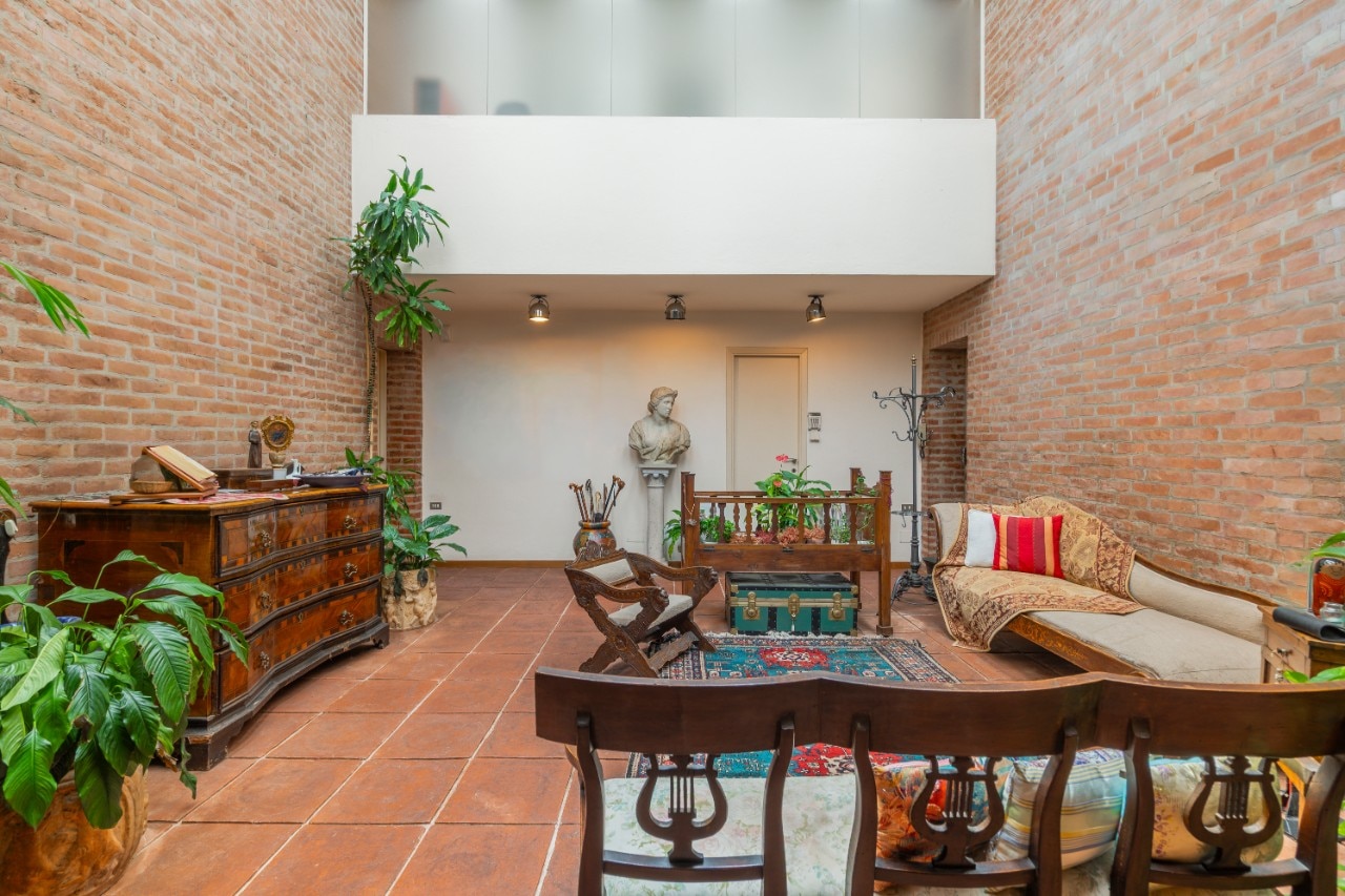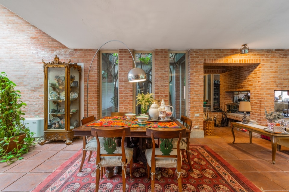 Outside, this logic takes shape in exposed brick volumes and sloping roofs that articulate the garden like a sequence of open-air rooms. Inside, the space unfolds in depth: a large living area traversed by partitions, openings, and skylights that draw light from above, while terracotta and brick punctuate both walls and floors.
