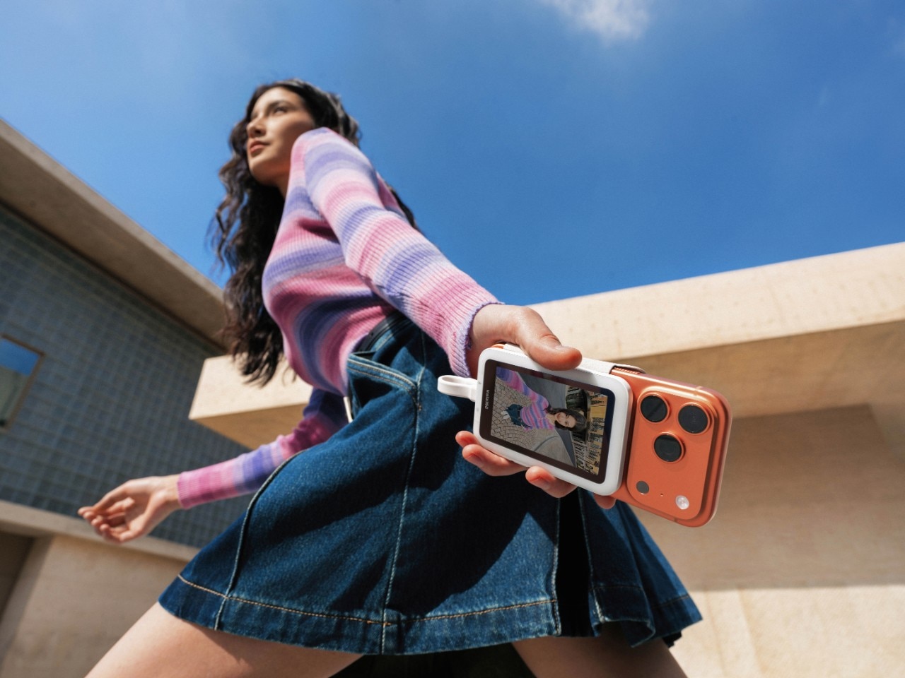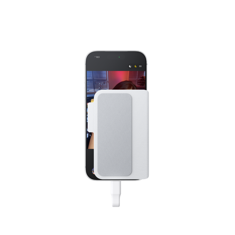 The device connects via USB-C and attaches to the back of the phone, mirroring the smartphone interface in real time. This allows users to frame themselves using the main sensors, avoiding the typical compromise of the front-facing camera.