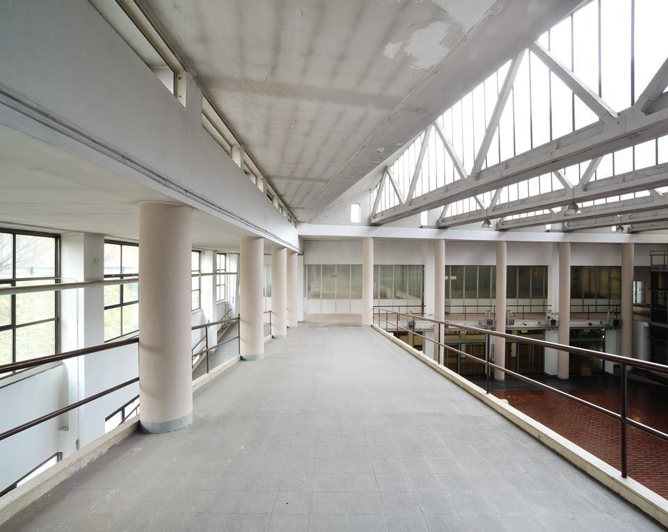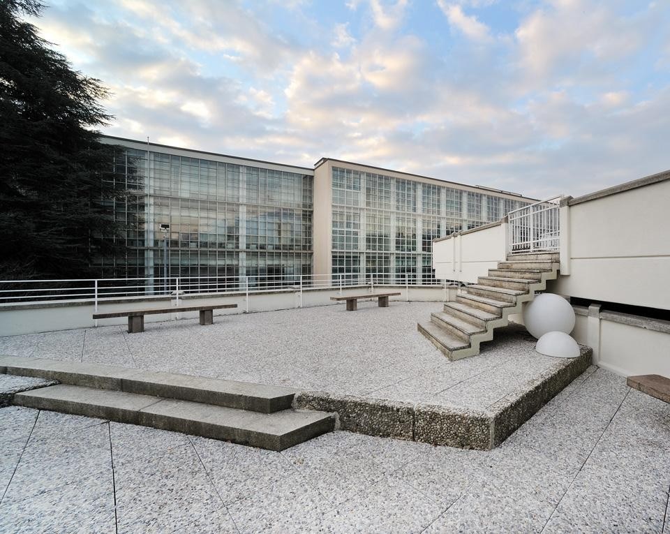 The Office Block designed to contain all the company's management functions in one place had just been commissioned, but financial problems within the company meant it could not complete the somewhat exotic outside design by landscape architect Pietro Porcinai. Entering the lobby and coming face to face with its central staircase — hexagonal in plan and serving the three blocks joined in a helix form — is a stunning experience. This is architecture that envelopes, hypnotises and alienates you, pushing the gaze upwards to a vaulted ceiling covered with hexagonal glass scales shaped like prisms that remind you of an industrious beehive.