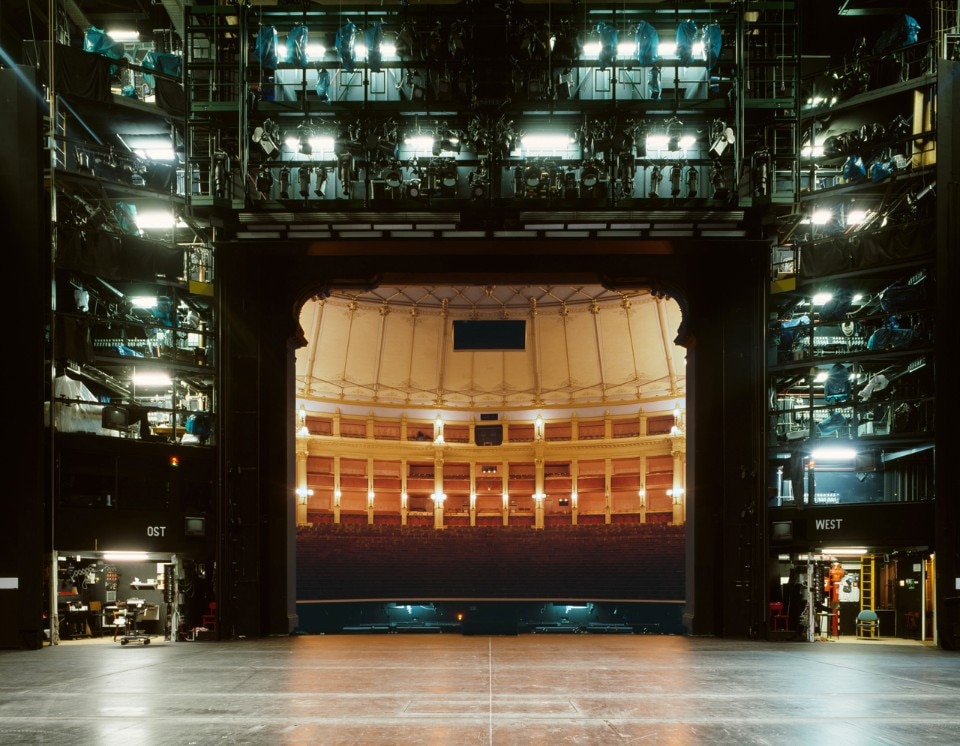 In the images the space for the audience is becoming flat like postcard and the real space of the theaters, the stage, is explored in many directions, looking up or to the sides and going into details. Thus we get aware of a work-space hidden behind the red curtain. It is the specific perspective of the camera, which dissolves the order of what is in front or behind, questioning the hierachy of stage and audience as well as the image.