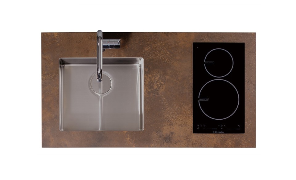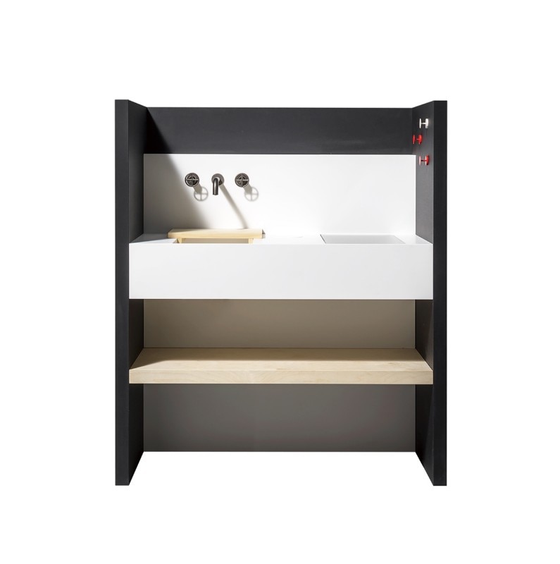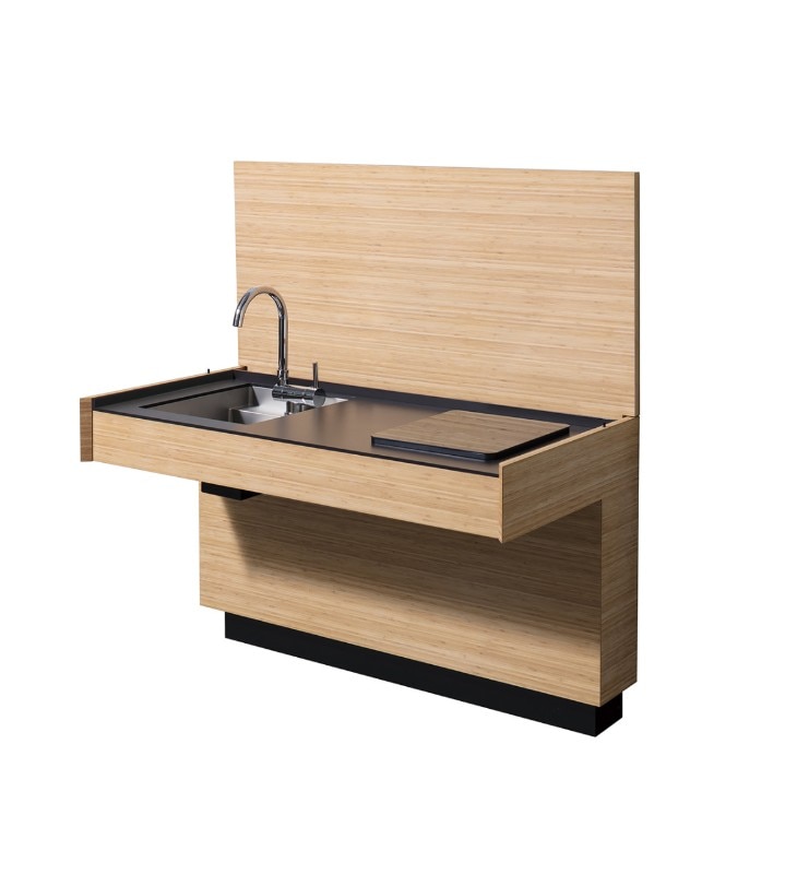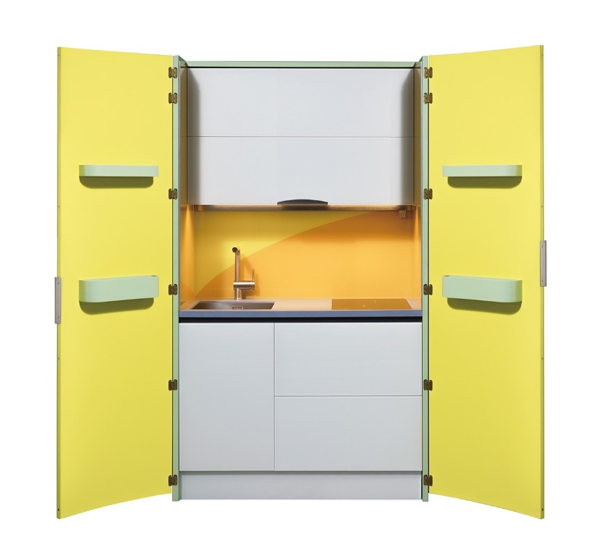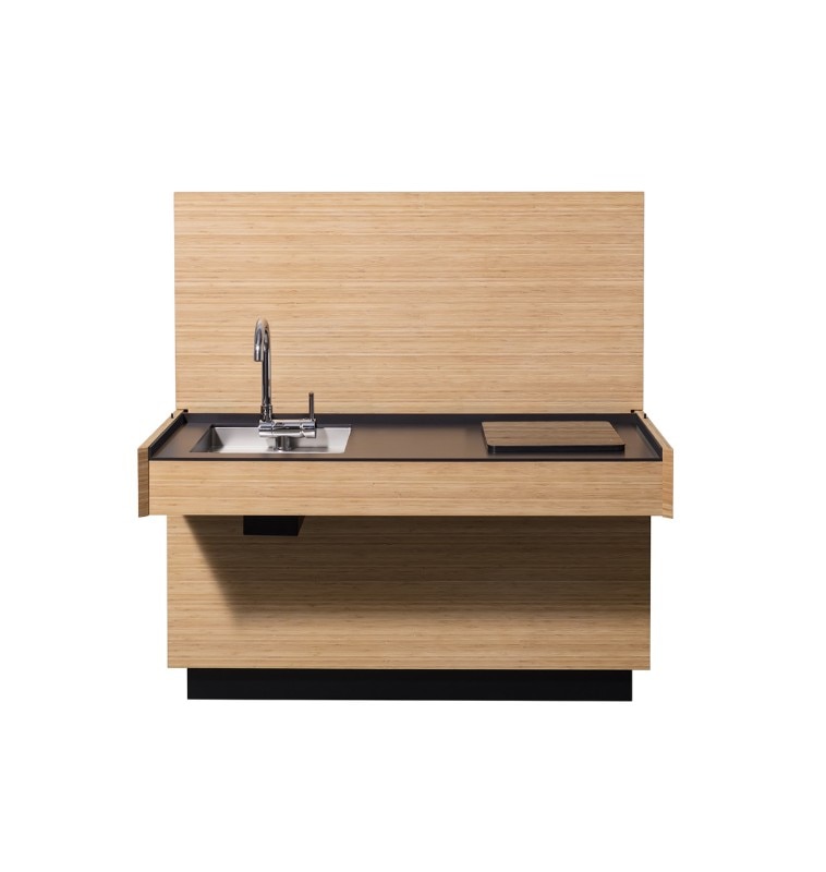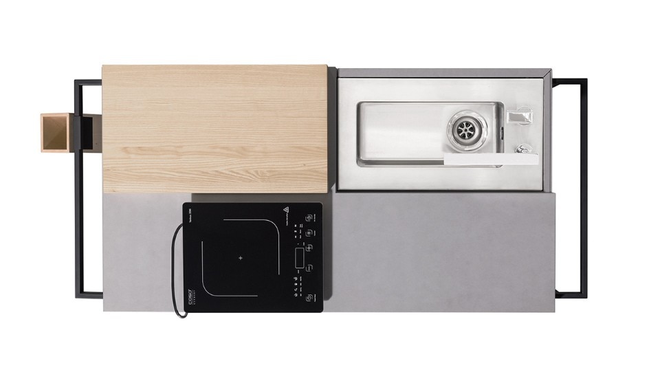 Here you are who was needed to refresh the glorious achivements of Joe Colombo’s Minikitcken: the kings of compulsive technological miniaturization. Just as much savvy to ask Alessandro Mendini, Elisa Ossino e Bestetti Associati to design the three compact top models: a cupboard with a geometrical pattern very much Mendini style, a monolite in total black if it wasn’t for a couple of white lines, an indoor/outdoor cart to carry around the house. However, the compact model that really gives satisfactions is the one called AC 01, because in a time where smartphones are used as credit cards then a desk can certainly hide underneath its surface an induction hob, right there where there was supposed to be a drawer. Designed by Yuto Rie, AC 01 is the real Sanwa’s transformer masterpiece. It’s one thing to hide a small kitchen inside a wardrobe, another one passing effortlessly from frying a couple of eggs to writing the usual one huondred daily mails, and without even getting up once.
