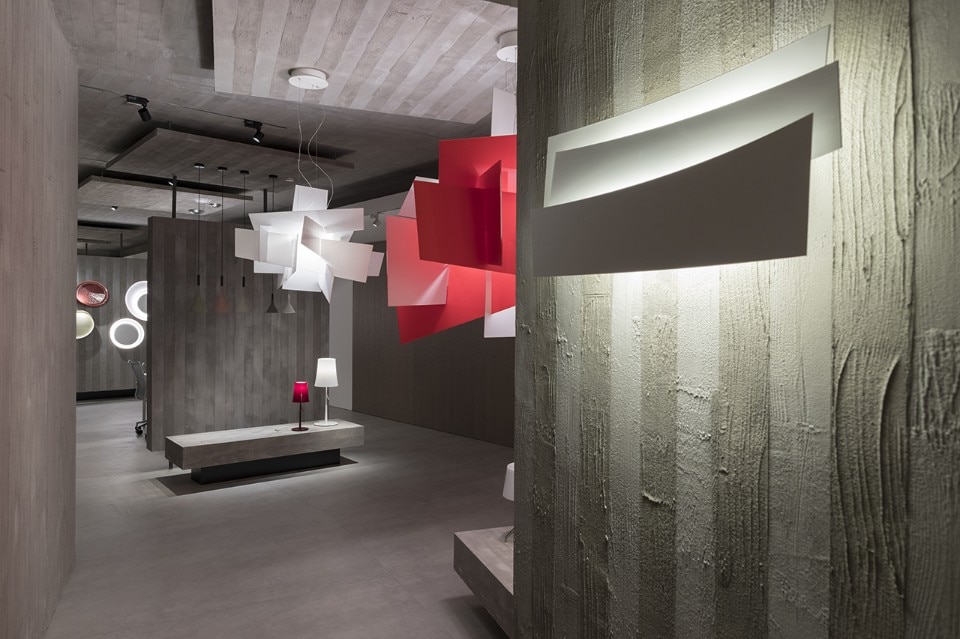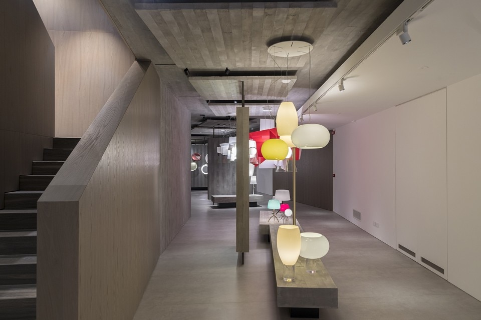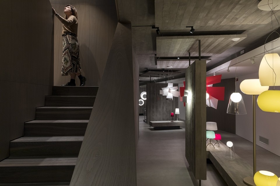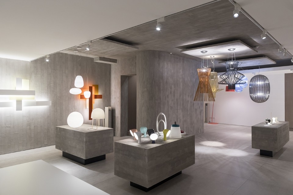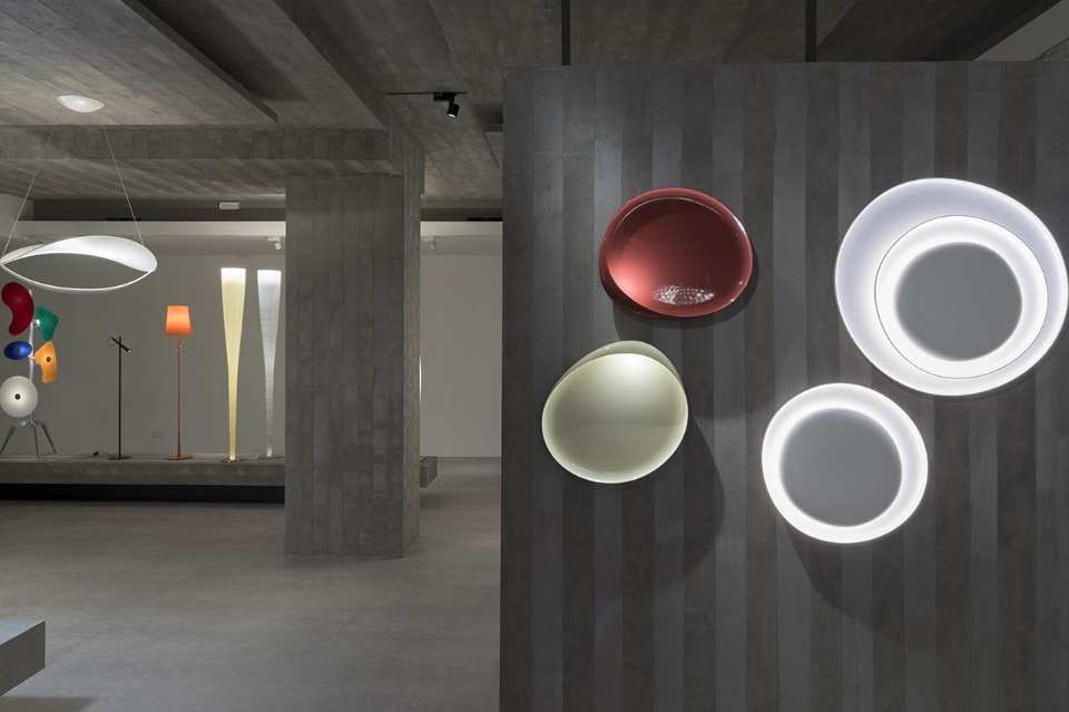 Concrete preserves the signs of the formwork, creating elegant patterns that enhance the bright colours and light of the lamps. “The display space has been designed for use as a zone of sale and reception, but also as a setting for artistic installations and product presentations”.