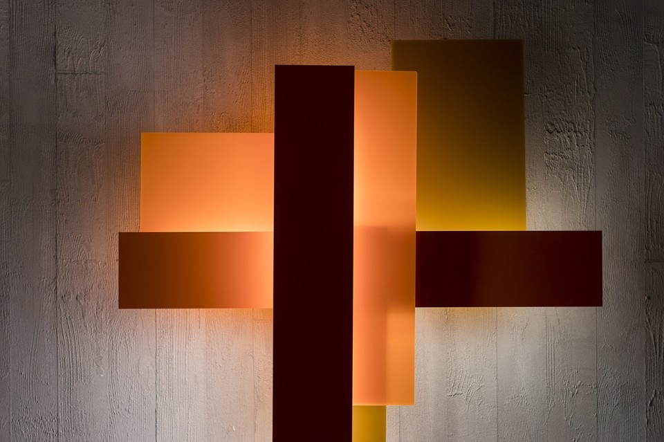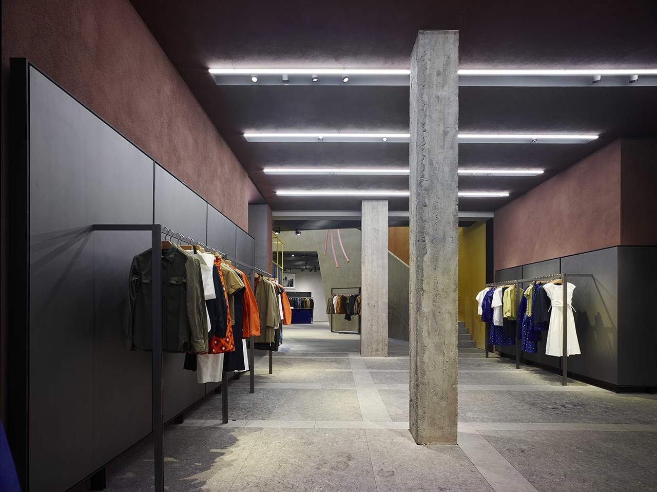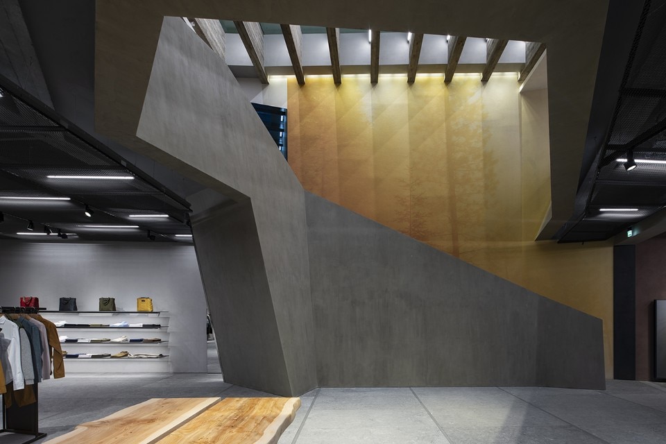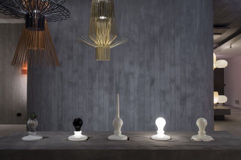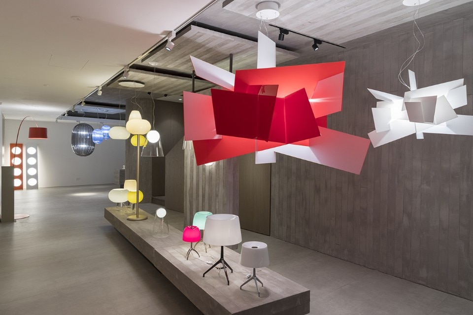 Concrete preserves the signs of the formwork, creating elegant patterns that enhance the bright colours and light of the lamps. “The display space has been designed for use as a zone of sale and reception, but also as a setting for artistic installations and product presentations”.