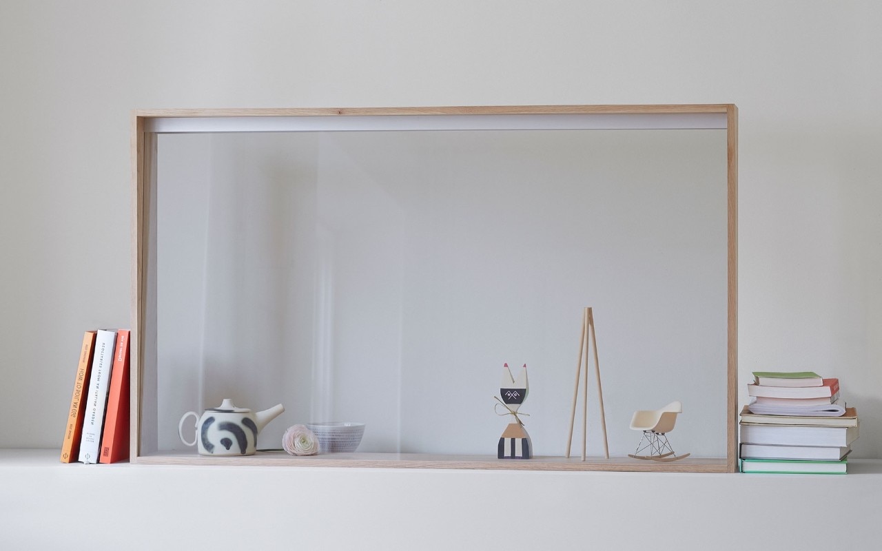 Swiss design brand Vitra and Panasonic collaborated on a new TV that looks like a transparent and minimal glass cabinet.