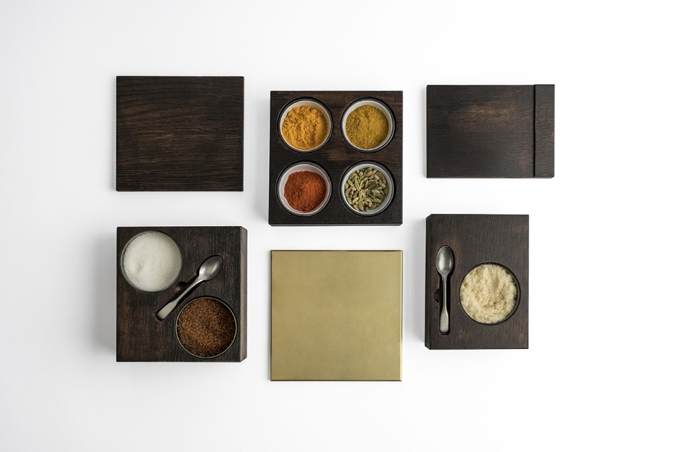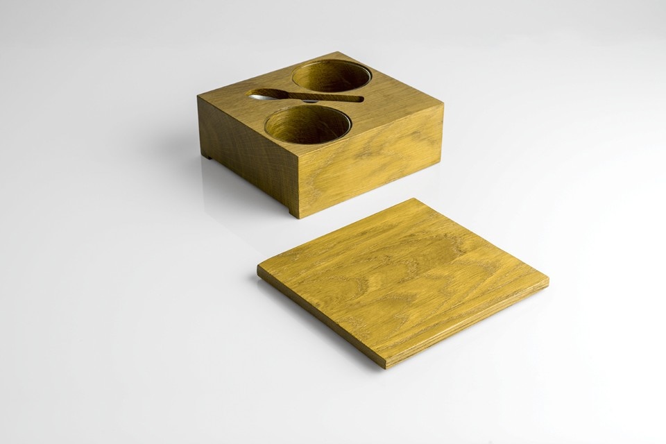 Five wooden boxes - oak boxes stained wenge, yellow or walnut - are more than just containers: they are mysterious and elegant objects that only show their true function when opened. The products in the Yellow Box collection can be used as sugar boxes, cheese boxes, spice boxes, sauce boxes and more, depending on the number of containers inside them.