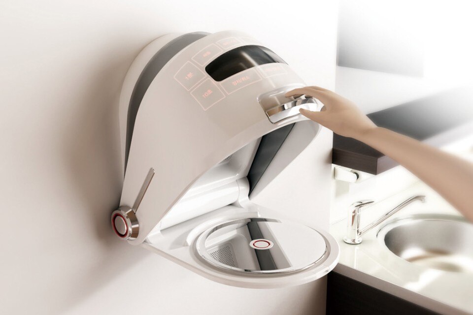 Microwave ovens, wether free-standing or built-in, all share the same design: a rectangular box with a front door that opens to a spinning plate. Designer Kevin Choi tries has tried to challenge that status quo by envisioning a microwave oven that you can install on a wall and opens up with a helmet-like system.