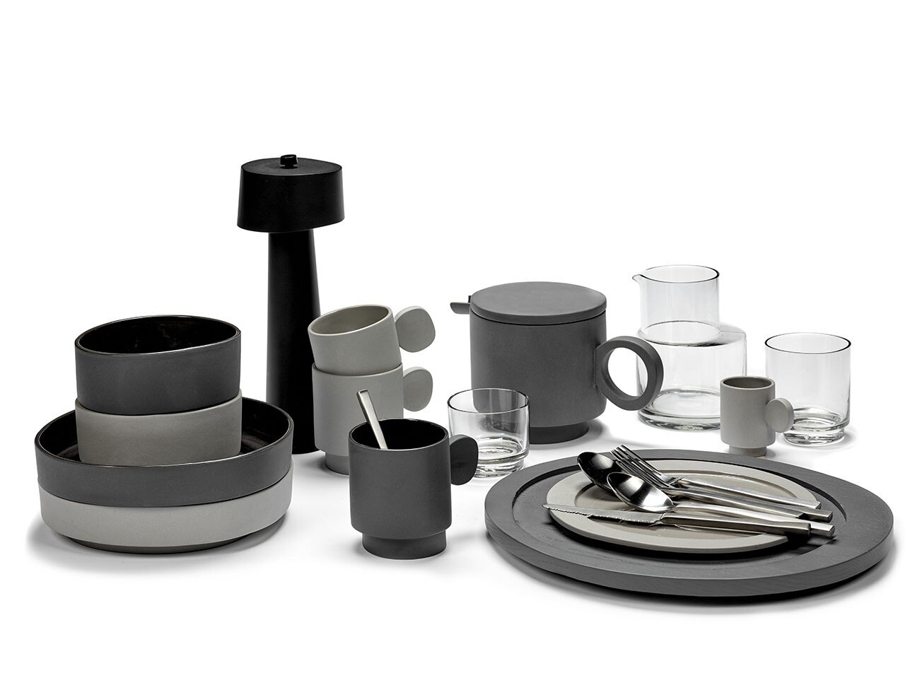 In addition to the bumpy asymmetry, the plates are characterized by non-colours declined on the grey scale, while the glasses, also slightly asymmetrical, make transparency a deliberate contrast. The novelties, launched last January, complement the accessories previously produced for the Belgian brand: a service of cutlery and an imposing pepper mill that, like a miniature tower, seems to friendly scrutinize the entire table.