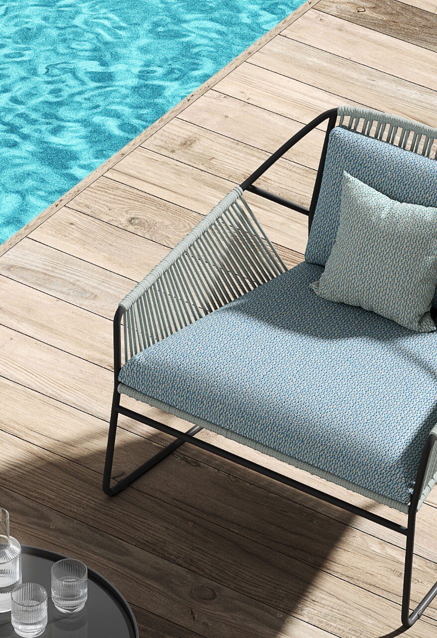 Initially conceived for seating, Farniente is a highly structured, wool-like bouclette fabric with water-repellent qualities and good resistance to chlorinated water. Splash, on the other hand, is distinguished by its structured weave enriched with yarns of different colours. Perfect for seatings and curtains, it has water-repellent properties and good chlorine resistance. Referring to the nuances of minerals, the carpet Sphérique features geometric patterns emulating the grooves left by the ocean in the sand. Versatile and essential, these series come in a variety of shades and guarantee waterproofing, resistance to light, mould and friction, as well as easy maintenance.