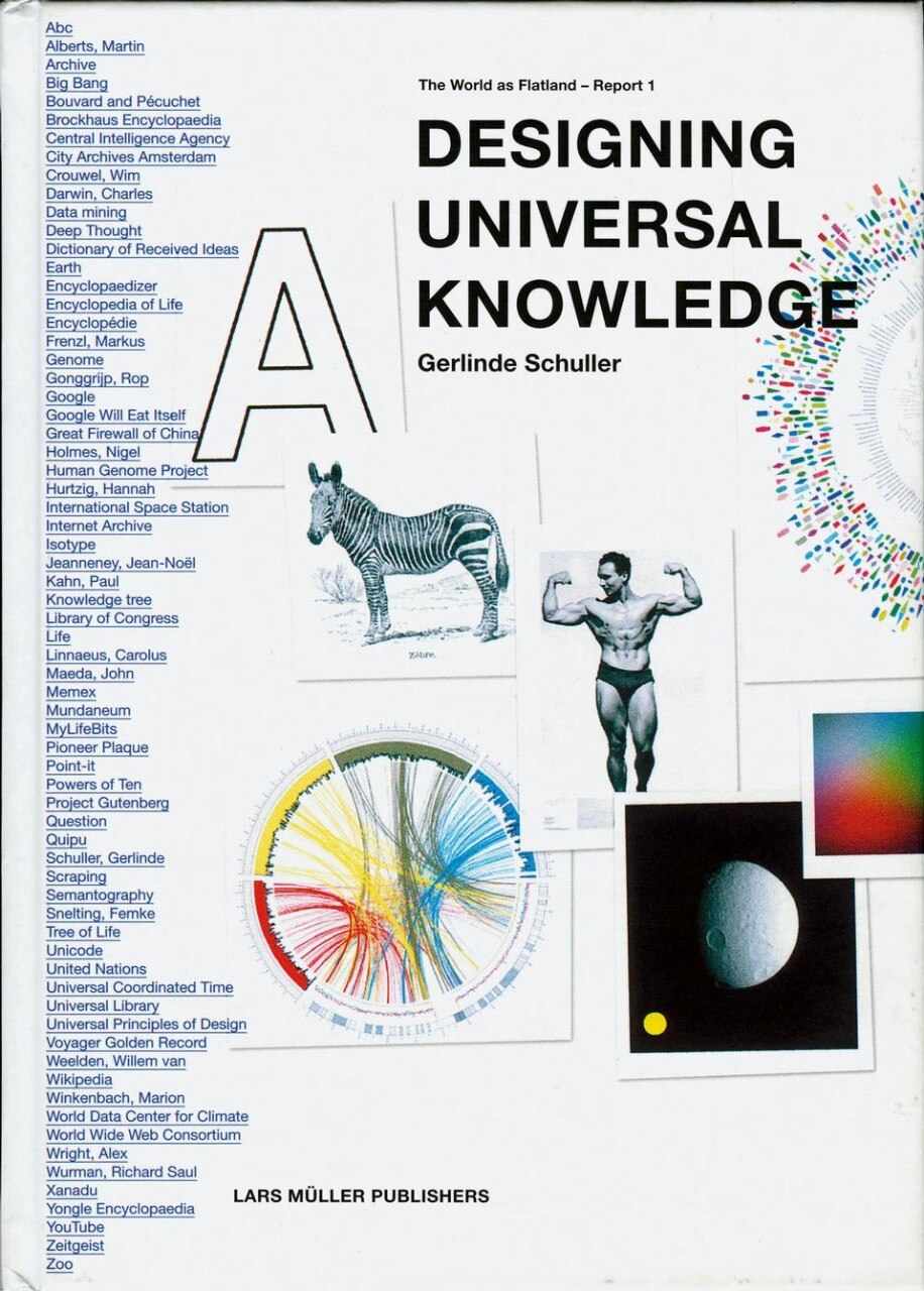 Alphabet, complexity, Encyclopaedia Britannica, genome, Google, Internet, knowledge management, non-knowledge, seed bank, simplicity, Trojan horse, World Wide Web, YouTube... these are just some of the 177 entries published by Gerlinde Schuller in her, selfconfessedly, ambitiously titled and intriguing book Designing Universal Knowledge. Who is collecting the world’s information? How are the archives of knowledge structured? Who determines access to the knowledge? What does the power of knowledge bring? These are the questions that prompted the research presented by Gerlinde Schuller in an “account” that investigates their meaning. Designing Universal Knowledge forms part of the series “The World as Flatland – Reports”, the first of three books on the design of complex information; the subsequent publications are Designing Breaking News and Designing World Projections. As the author explains, “The World as Flatland” is a metaphor for transferring complex information to the simplest “two-dimensional visualisation”. The Internet is comparable to other complex autopoietic models, systems that define themselves and tend to sustain themselves, like markets and, indeed, living beings. Gerlinde Schuller wants to simplify; she wants to bring order into the new world of Web 2.0, in which user participation in the creation of contents and in the various forms of communication, from videos to photographs, blogs and even software programmes, is ever more interactive, contagious, fast and, inevitably, chaotic.