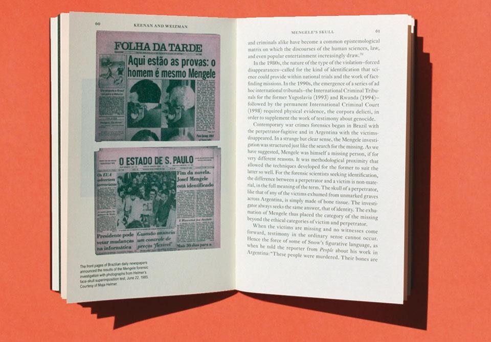 Mengele's Skull: The Advent of a Forensic Aesthetics, co-authored by Thomas Keenan and Eyal Weizman, focuses on the 1985 committee of experts who went down to Brazil to identify a skull as that of Nazi war criminal Josef Mengele. The book was published on the occasion of an exhibition at Portikus, Frankfurt am Main, which was part of a forum and research group headed by Weizman and run by the Centre for Research Architecture at the Department of Visual Cultures, Goldsmiths, University of London. The multidisciplinary project team included architects, artists, geographers, scientists, information designers, jurists and media scholars.
