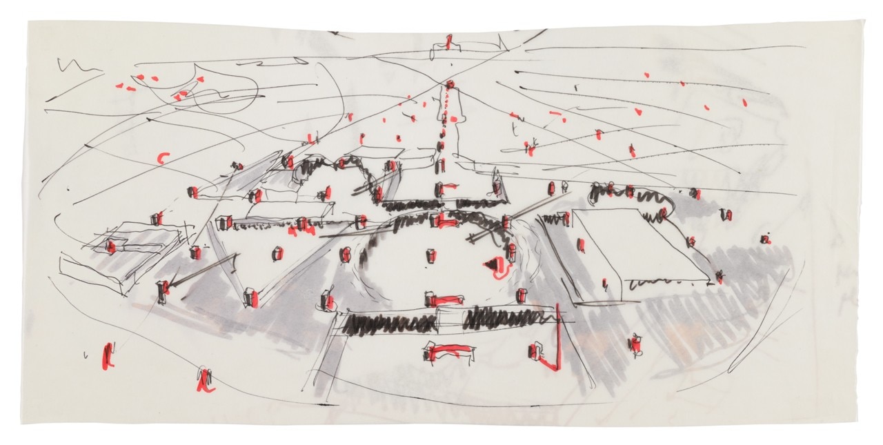 And secondly, more than any other of his peer theorists, Tschumi made building an explicit component of his theoretical project with his declaration “architecture is the materialization of concepts.” And when visiting a Tschumi building, there is no question about it, the materialization of concepts is beyond doubt. These concepts are by no means quotidian “solutions” to program and context. They are, rather sophisticated socio-architectural conjectures that inform every decision. In that regard, one issue that the exhibition foregrounded was the shift from the early abstract-notational approach to building to the blunt tectonics that dominates the work by the late 90’s. I remember Tschumi referring to it as his move to a degree zero approach, a description that his disappeared from his writing but that I will use here for convenience. To be sure, it is a matter of some theoretical importance.