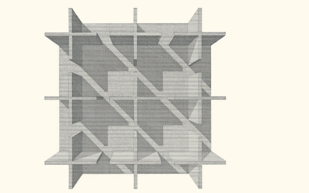 Aureli’s visions are the fruit of a particular choice and the primary technique is that of the regular broken line, the tools being pencil and ink; the paper format is always the same, 50 x 50 cm and the theme buildings with no specific programme.