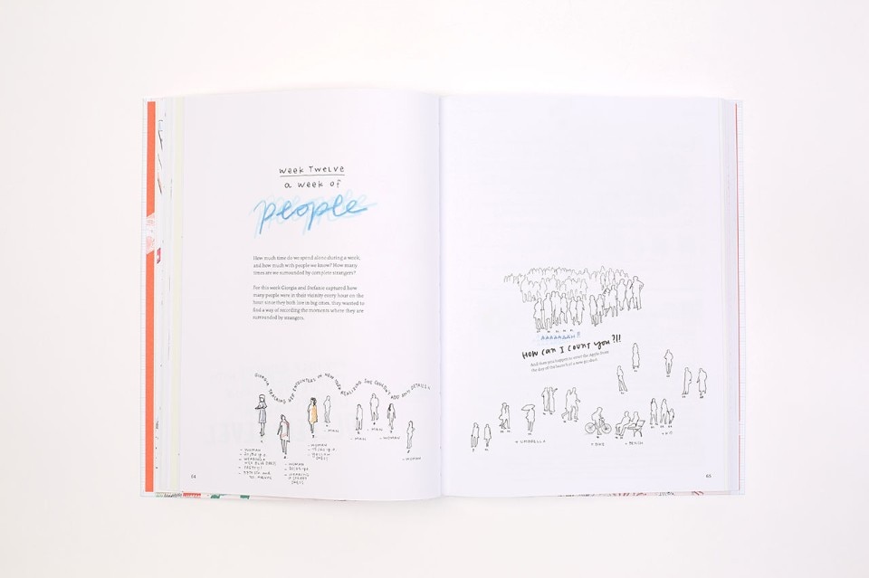 Giorgia Lupi + Stefanie Posavec: Usually, people associate the quantifiable and the quantitative with precision and objectivity. So the use of personal data is seen as a way to solve problems and find rational answers. We did not want to optimise our life; rather we were stimulated by the curiosity to discover the seemingly insignificant details of our days. We learned to look more carefully at our surroundings and the way we perceive them, week after week. Naturally, not everyone has the time to dedicate themselves to a project like ours, but over that year during which we monitored our relations, friendships and interactions, we were able to see for ourselves that data are not abstract entities, collected and processed by big institutions, but something very close to us that everyone possesses and can find in all aspects of their lives. They can help us understand ourselves better. Data are a raw material, a material we use to observe and document reality. Not using our computer for the Dear Data project forced us to find different ways of looking at data, and those ways gave us the excuse to say something about ourselves.